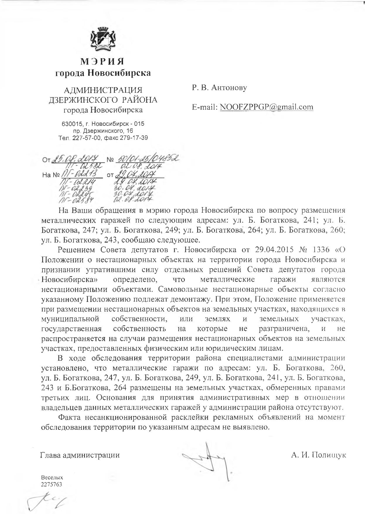 Номер жалобы:22013 Тип жалобы:Иные проблемы ЖКХ Название объекта:Управляющая Компания Город:Новосибирск Адрес:Новосибирск, улица Бориса Богаткова, 243 Описание жалобы:Гаражи Статус: