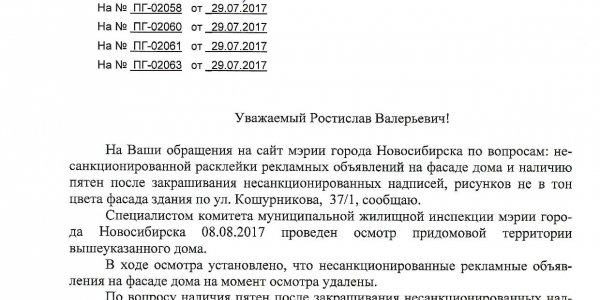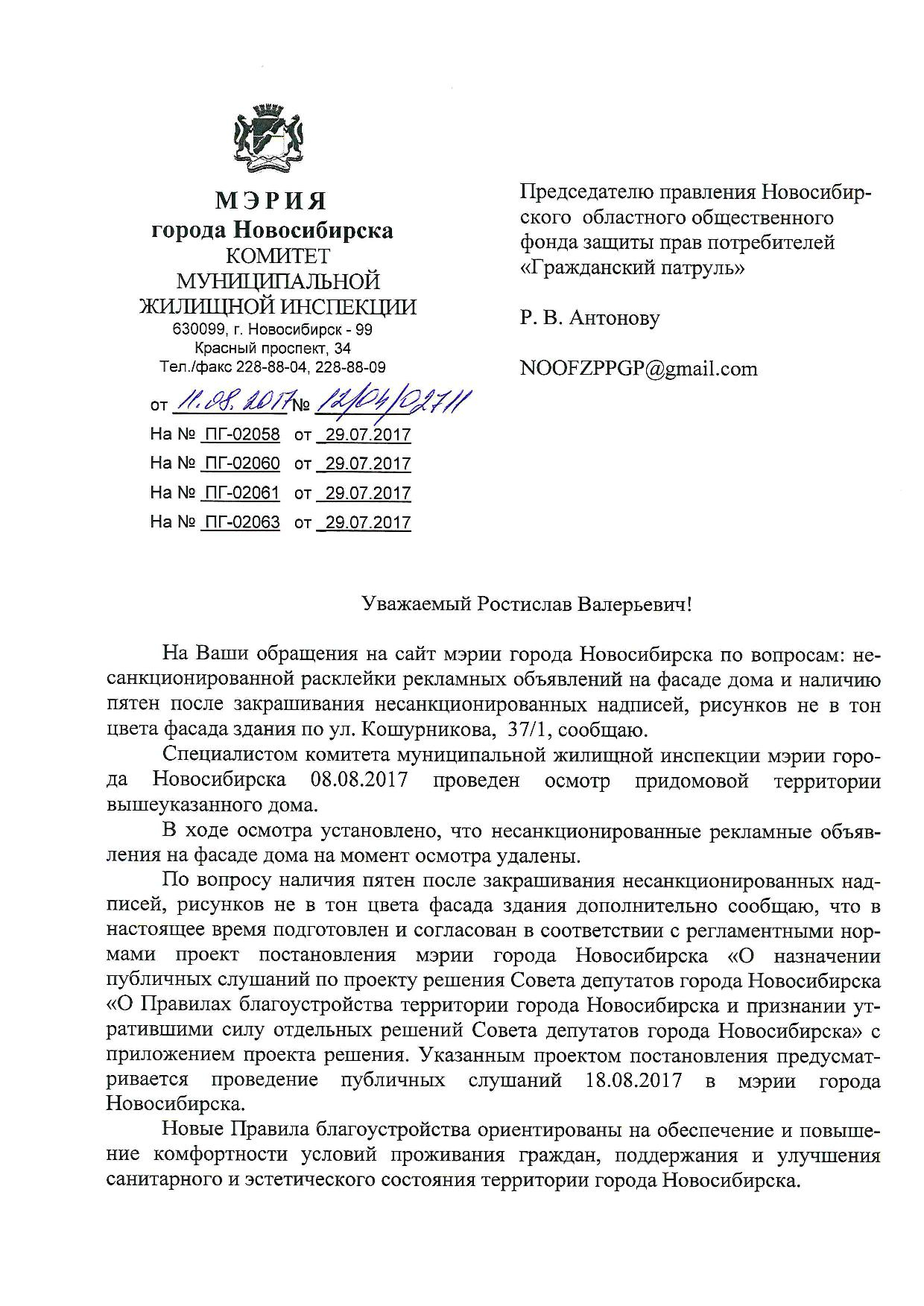 Номер жалобы:21977 Тип жалобы:Иные проблемы ЖКХ Название объекта:Управляющая Компания Город:Новосибирск Адрес:Новосибирск, улица Кошурникова, 37/1 Описание жалобы:Фасад разрисован Статус:
