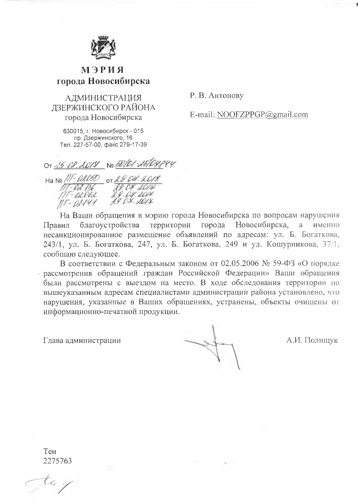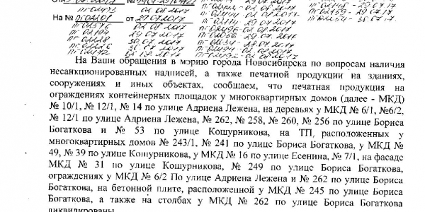 Номер жалобы:21983 Тип жалобы:Иные проблемы ЖКХ Название объекта:Управляющая Компания Город:Новосибирск Адрес:Новосибирск, улица Бориса Богаткова, 243/1 Описание жалобы:Объявления в неположенном месте Статус: