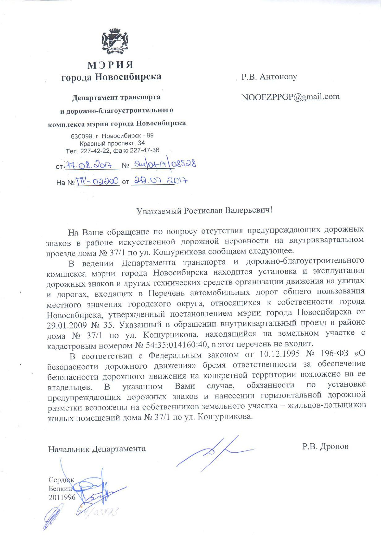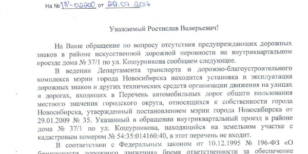 Номер жалобы:21976 Тип жалобы:Иные проблемы ЖКХ Название объекта:Управляющая Компания Город:Новосибирск Адрес:Новосибирск, улица Кошурникова, 37/1 Описание жалобы:Лежачий полицейский без знака Статус: