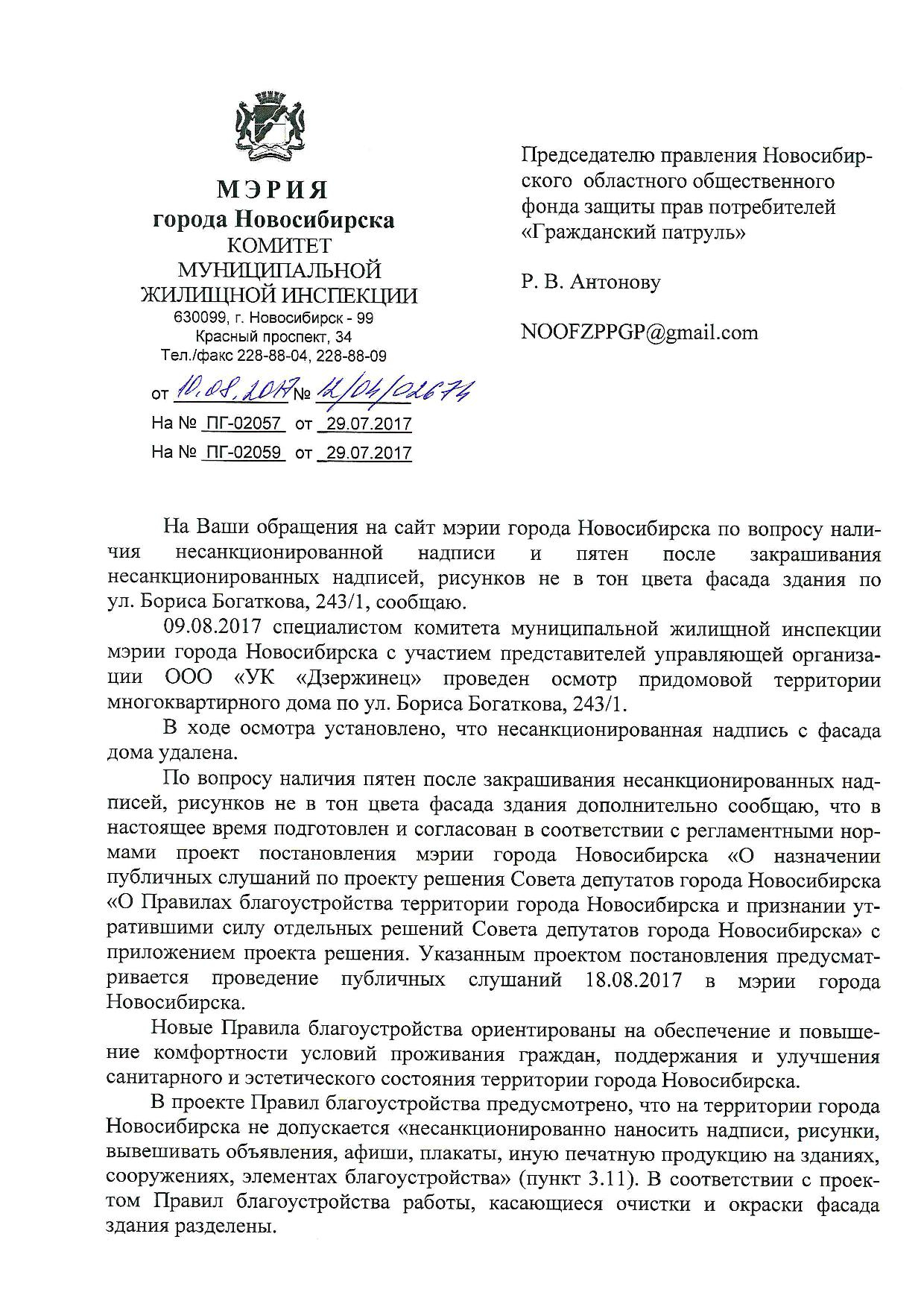 Номер жалобы:21981 Тип жалобы:Иные проблемы ЖКХ Название объекта:Управляющая Компания Город:Новосибирск Адрес:Новосибирск, улица Бориса Богаткова, 243/1 Описание жалобы:Фасад разрисован Статус: