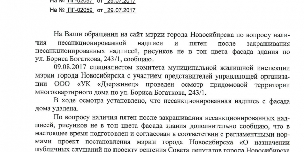 Номер жалобы:21980 Тип жалобы:Иные проблемы ЖКХ Название объекта:Управляющая Компания Город:Новосибирск Адрес:Новосибирск, улица Бориса Богаткова, 243/1 Описание жалобы:Фасад разрисован Статус: