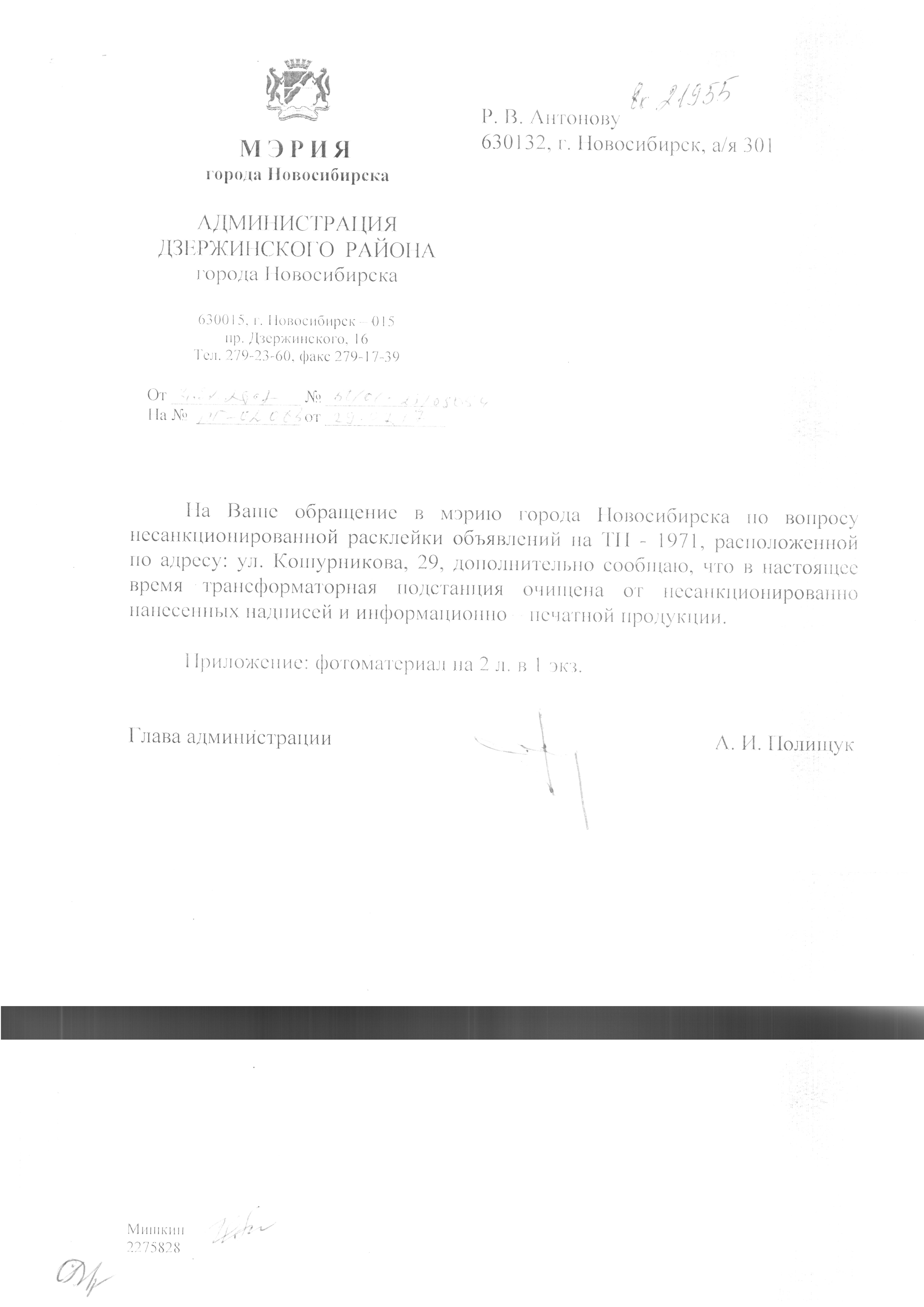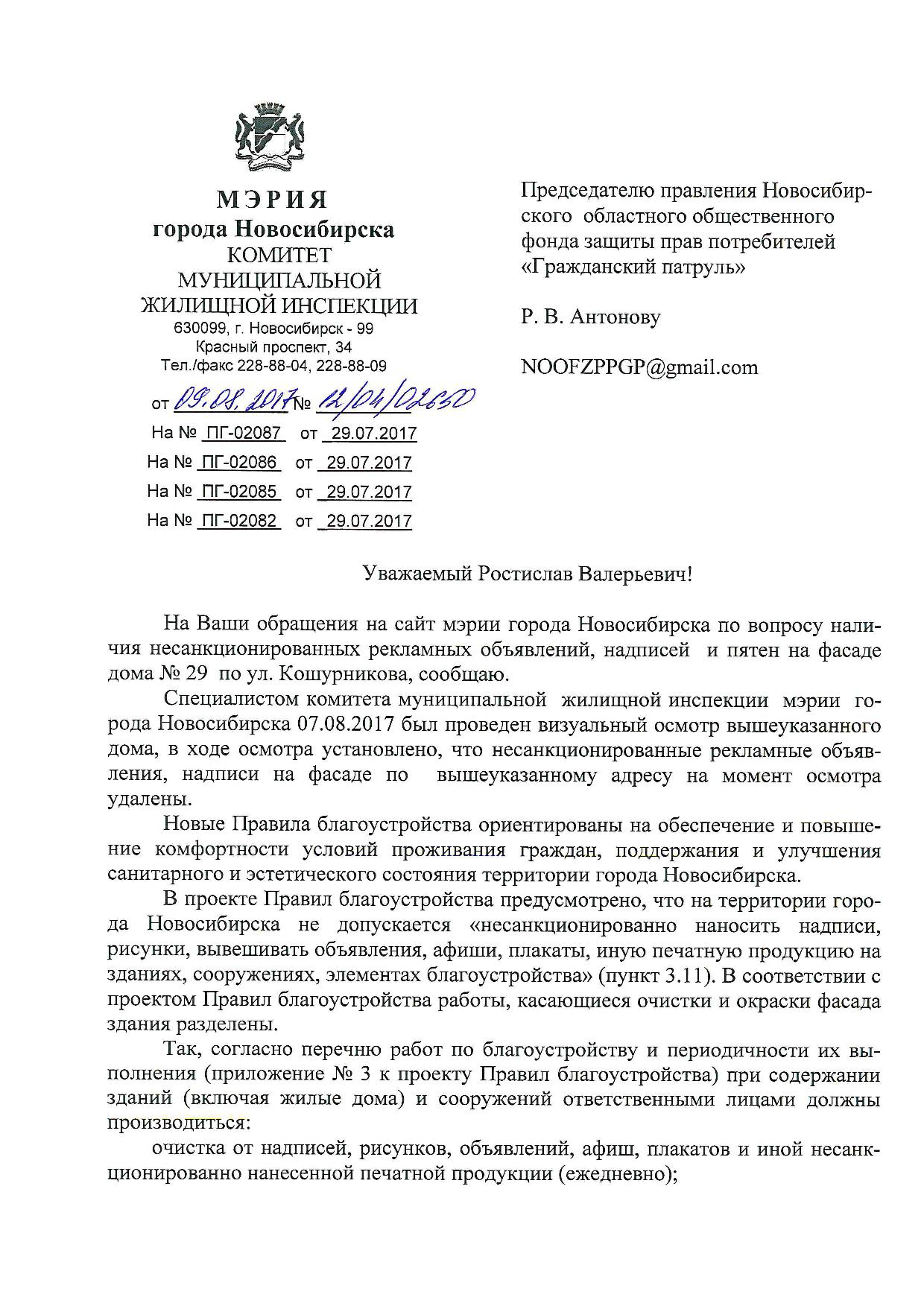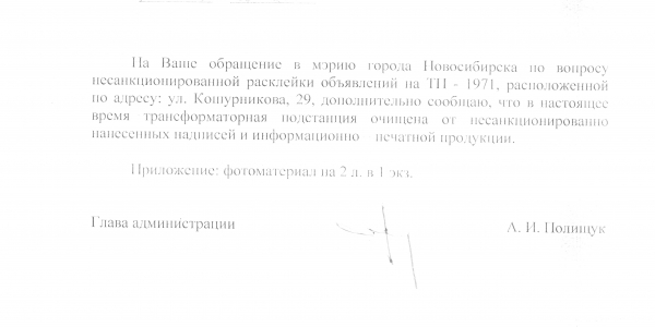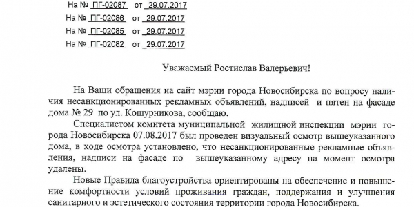 Номер жалобы:21956 Тип жалобы:Иные проблемы ЖКХ Название объекта:Управляющая Компания Город:Новосибирск Адрес:Новосибирск, улица Кошурникова, 29 Описание жалобы:Фасад дома разрисован. Кошурникова 29 Статус:
