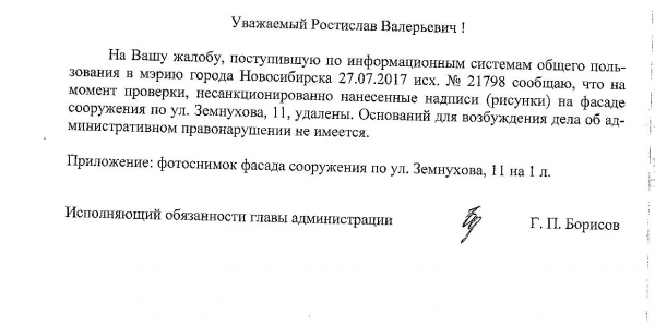 Номер жалобы:21798 Тип жалобы:Иные проблемы ЖКХ Название объекта:Управляющая Компания Город:Новосибирск Адрес:Новосибирск, улица Земнухова, 11 Описание жалобы:Фасад разрисован Статус: