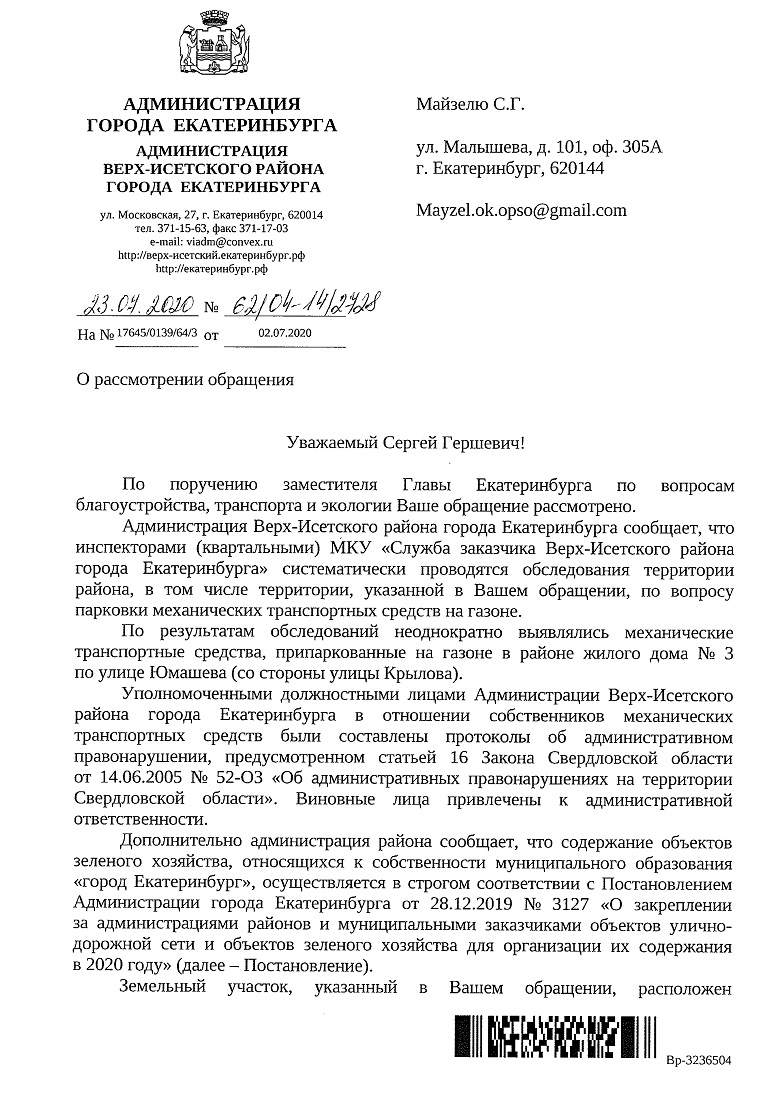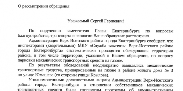 Номер жалобы:66921 Тип жалобы:Прочее Название объекта:мэрия Регион:Свердловская область Город:Екатеринбург Адрес:улица Юмашева, 3 Описание жалобы:Необходима установка ограждений с целью препятствия заезда машин на газон. Статус: