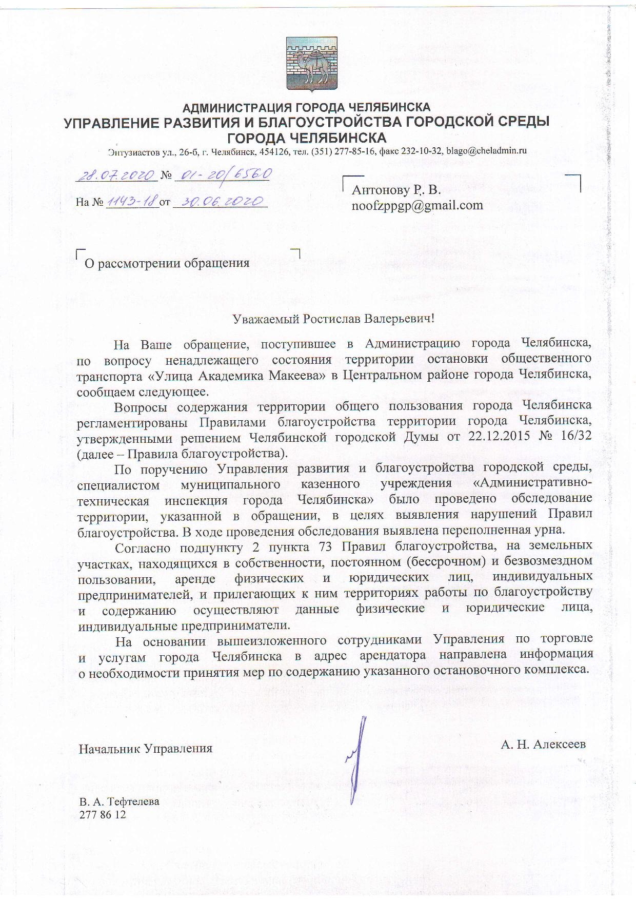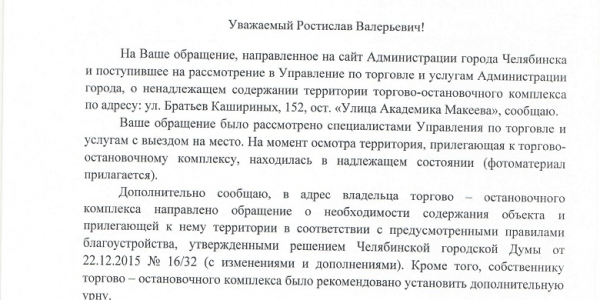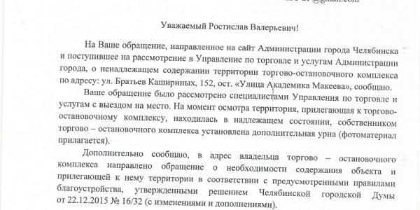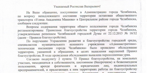 Прошу принять меры по соблюдению правил благоустройства города Челябинска и исключить их нарушение.