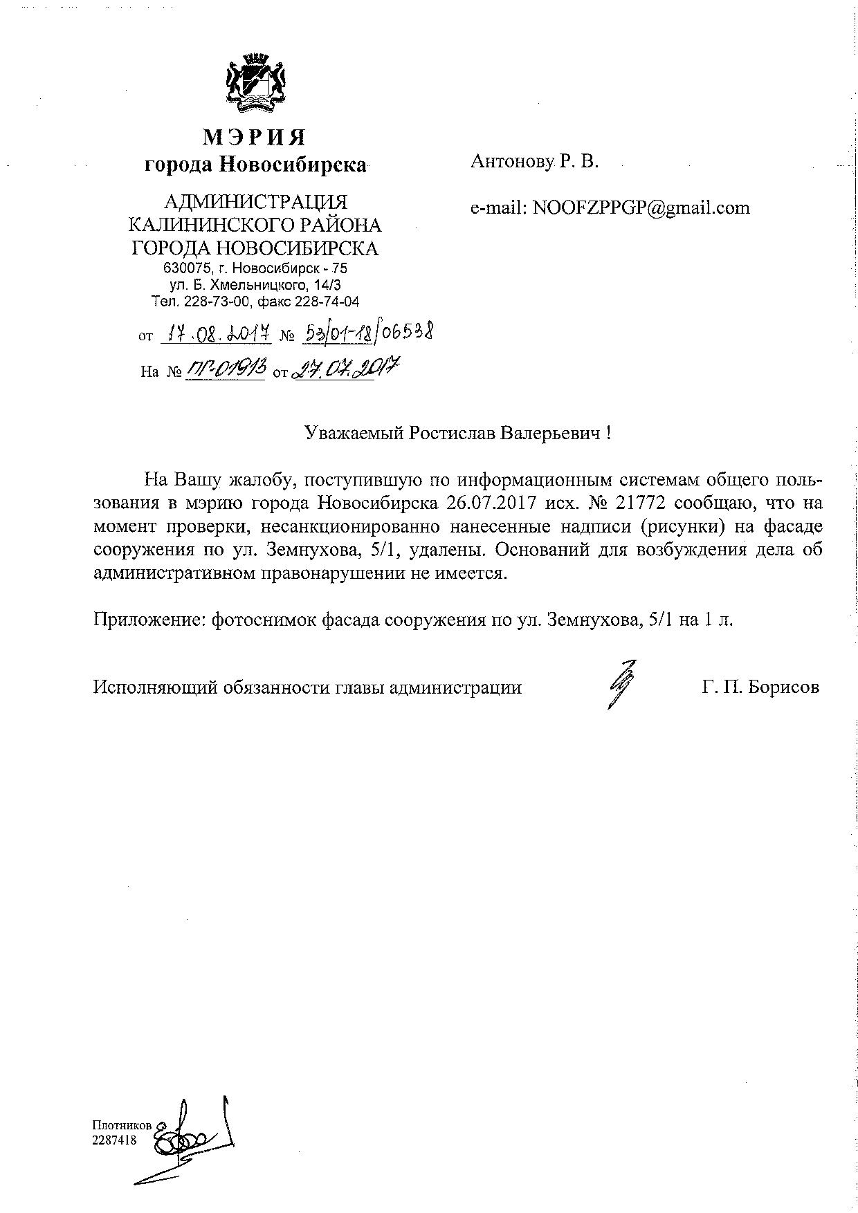 Номер жалобы:21774 Тип жалобы:Иные проблемы ЖКХ Название объекта:Управляющая Компания Город:Новосибирск Адрес:Новосибирск, улица Земнухова, 5/1 Описание жалобы:Фасад разрисован Статус: