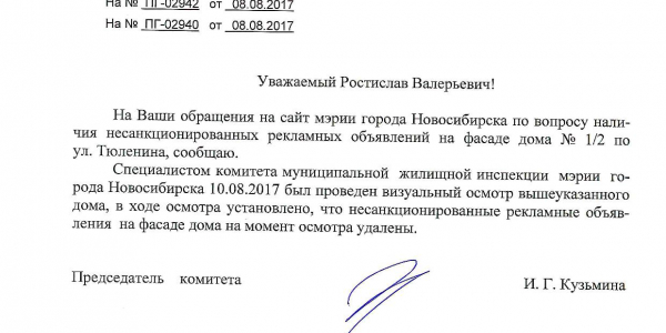 Номер жалобы:21768 Тип жалобы:Иные проблемы ЖКХ Название объекта:Управляющая Компания Город:Новосибирск Адрес:Новосибирск, улица Тюленина, 1/2 Описание жалобы:Объявления в неположенном месте Статус: