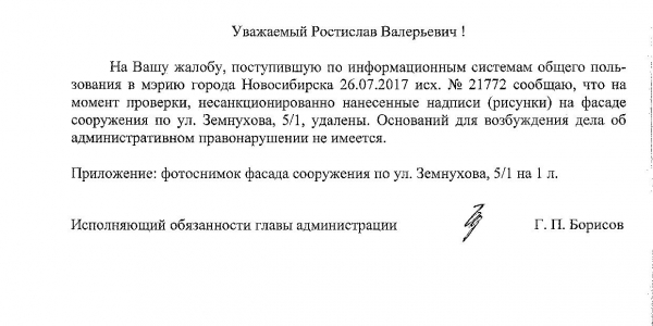 Номер жалобы:21772 Тип жалобы:Иные проблемы ЖКХ Название объекта:Управляющая Компания Город:Новосибирск Адрес:Новосибирск, улица Земнухова, 5/1 Описание жалобы:Фасад разрисован Статус: