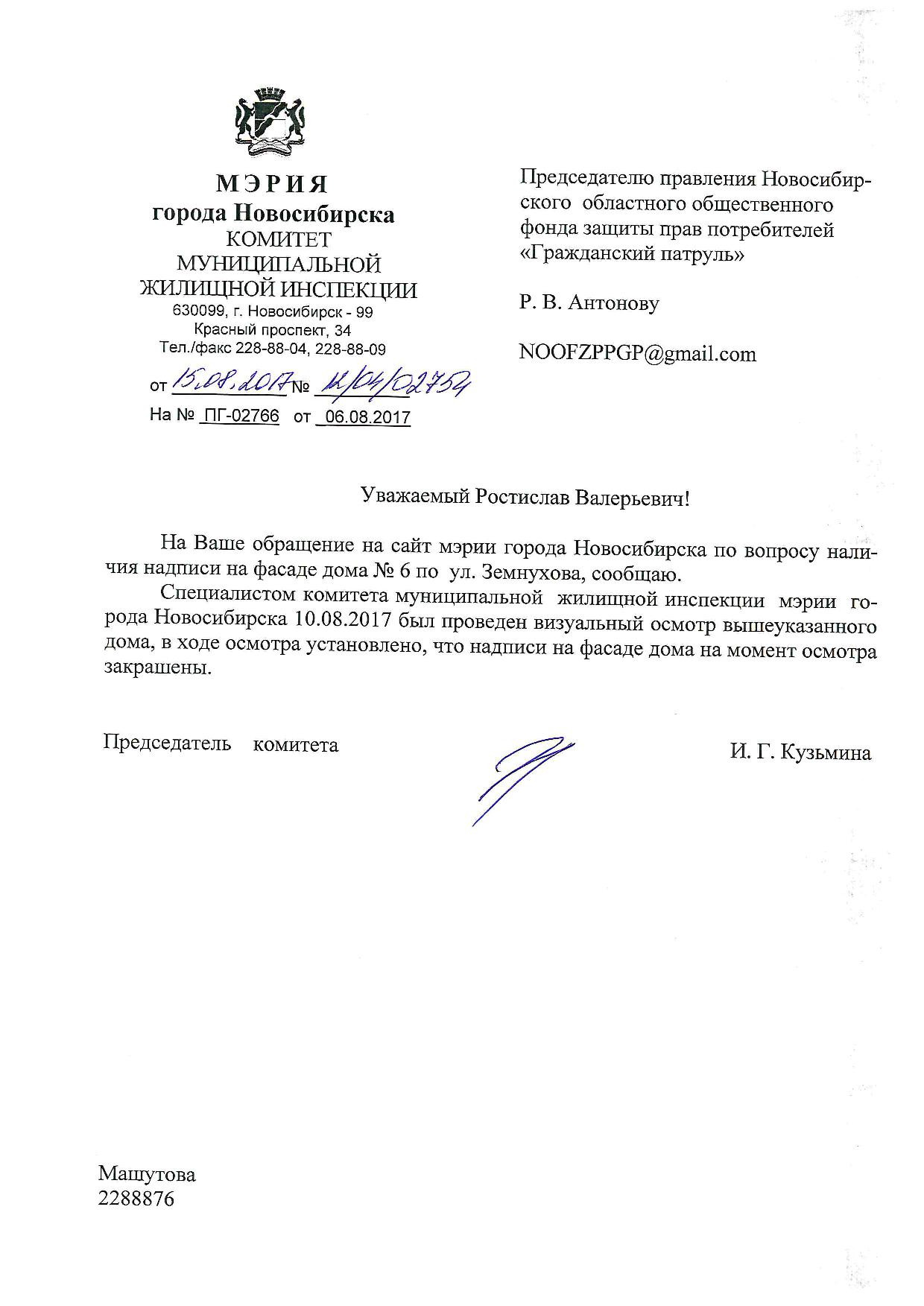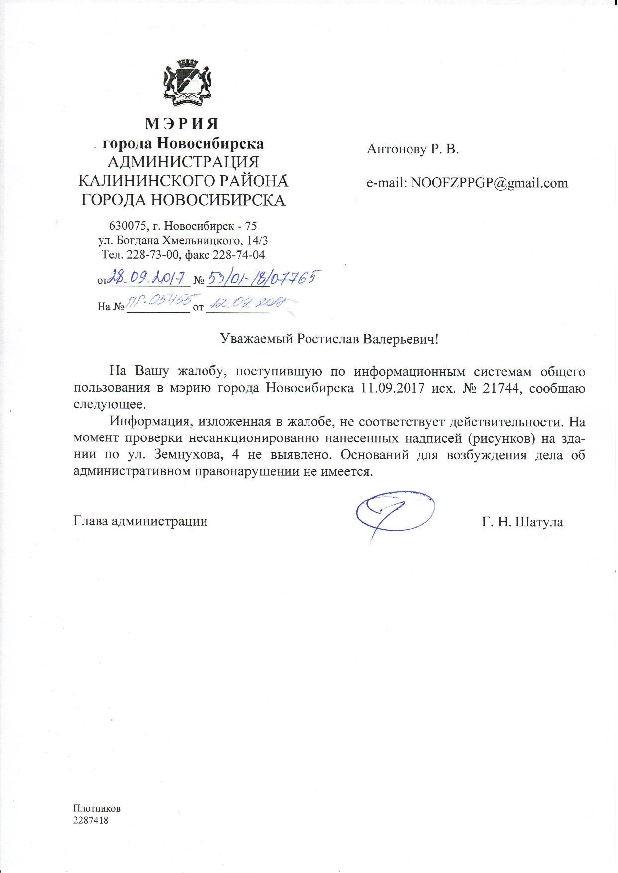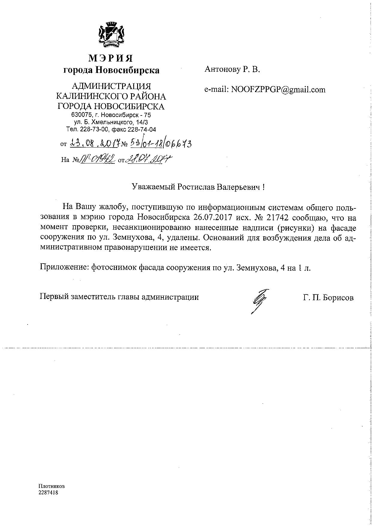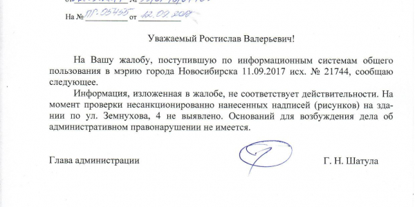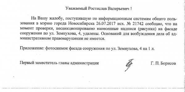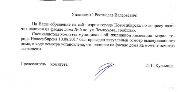 Номер жалобы:21742 Тип жалобы:Иные проблемы ЖКХ Название объекта:Управляющая Компания Город:Новосибирск Адрес:Новосибирск, улица Земнухова, 4 Описание жалобы:Фасад разрисован Статус: