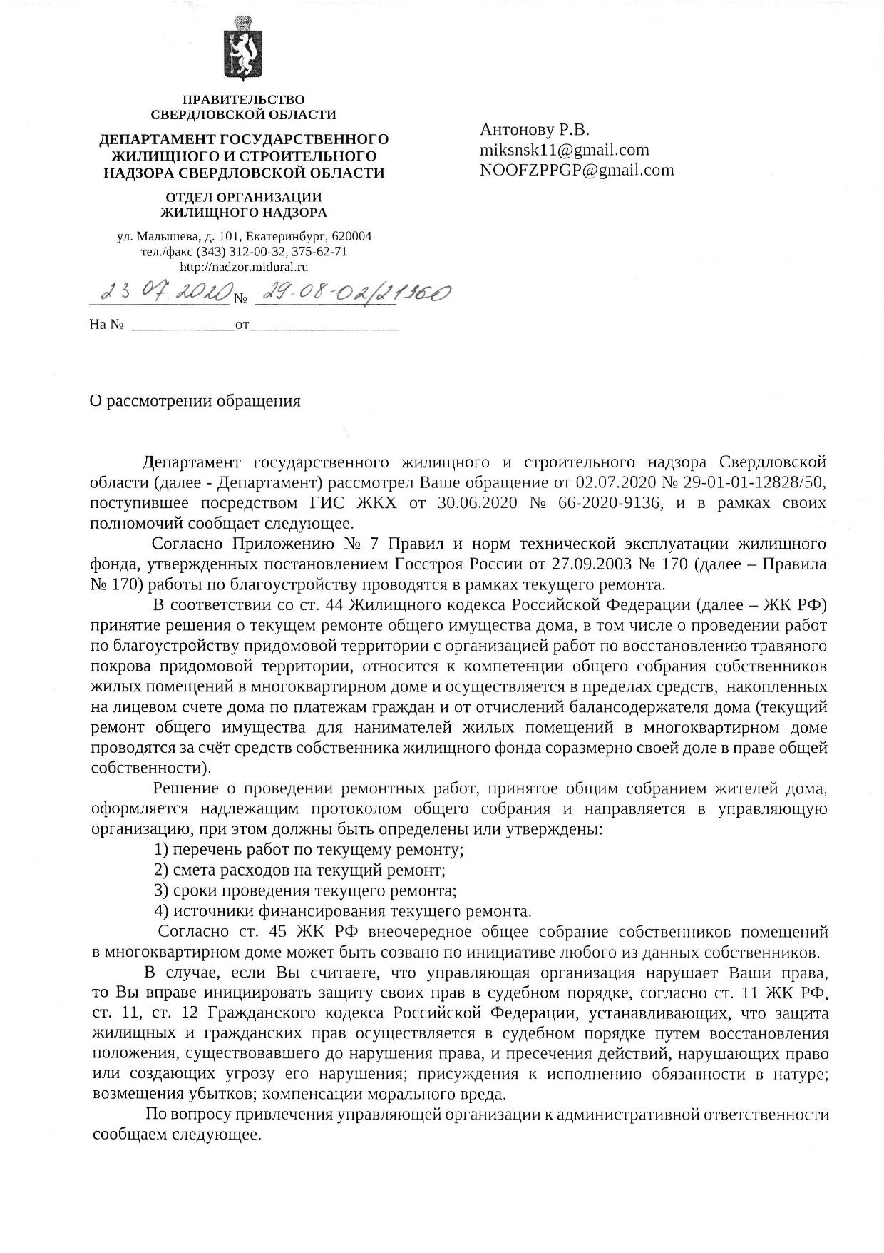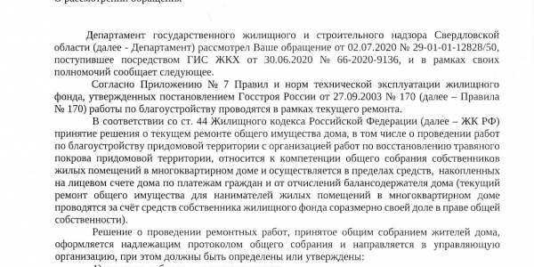 Номер жалобы:66870 Тип жалобы:Прочее Название объекта: Регион:Свердловская область Город:Екатеринбург Адрес:улица Победы, 94 Описание жалобы: 25 мая 2020 года во дворе дома 94 по улице Победы был перекопан газон. В настоящее время, 27 июня 2020, последствия не устранены, травяной покров не восстановлен. Статус: