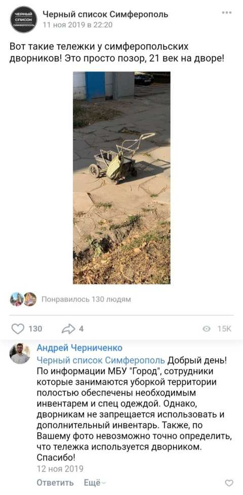 Номер жалобы:66901 Тип жалобы:Прочее Название объекта: Регион:Республика Крым Город:Симферополь Адрес:Симферополь, проспект Кирова, 13 Описание жалобы:Администрация Симферополя не в состоянии обеспечить финансирование МБУ "Город", руководство которого, как минимум с ноября 2019, не в состоянии обеспечить закупку тележек, тачек, метел для своих работников.
