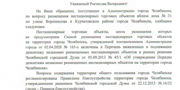 Номер жалобы:66787 Тип жалобы:Прочее Название объекта: Регион:Челябинская область Город:Челябинск Адрес:улица Ворошилова, 31 Описание жалобы:Большое количество ларьков в одном месте. Большинство из них незаконные. Мешают проходу граждан. Обведенный мной ларек возник дней пять назад. Вряд-ли кто-то дал на него разрешение. А бетонную площадь можно благоустроить создав сквер. Статус: