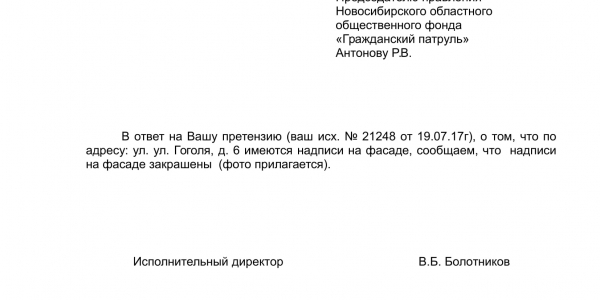 Номер жалобы:21248 Тип жалобы:Иные проблемы ЖКХ Название объекта:Управляющая Компания Регион:Новосибирская область Город:Новосибирск Адрес:ул. Гоголя, 6 Описание жалобы:Надписи на фасаде дома Статус: