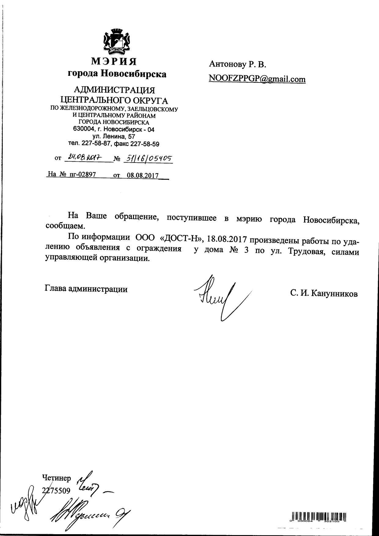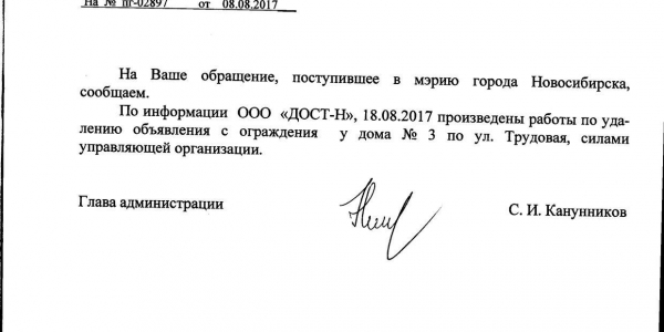 Номер жалобы:21194 Тип жалобы:Иные проблемы ЖКХ Название объекта:Управляющая Компания Регион:Новосибирская область Город:Новосибирск Адрес:Трудовая ул., 3 Описание жалобы:Объявление на заборе Статус: