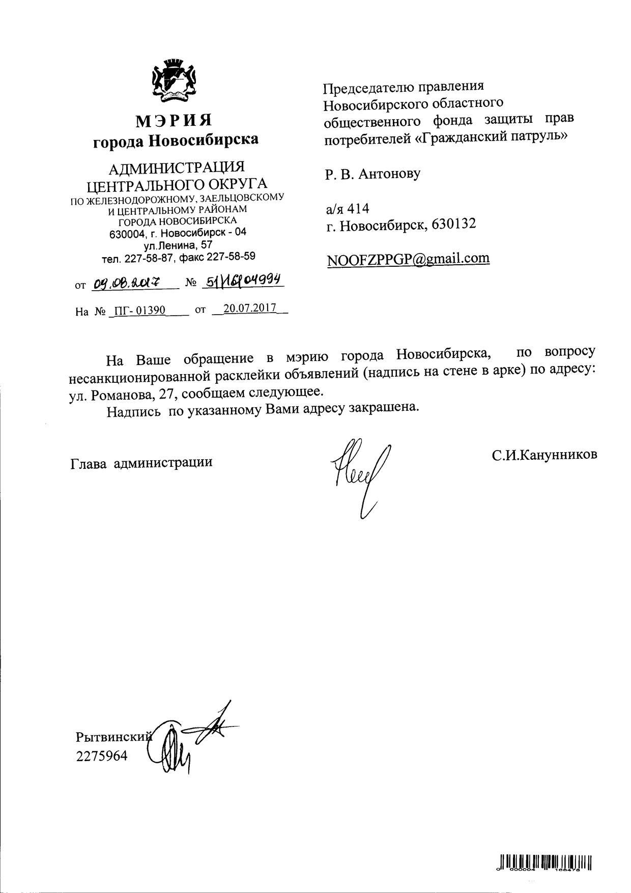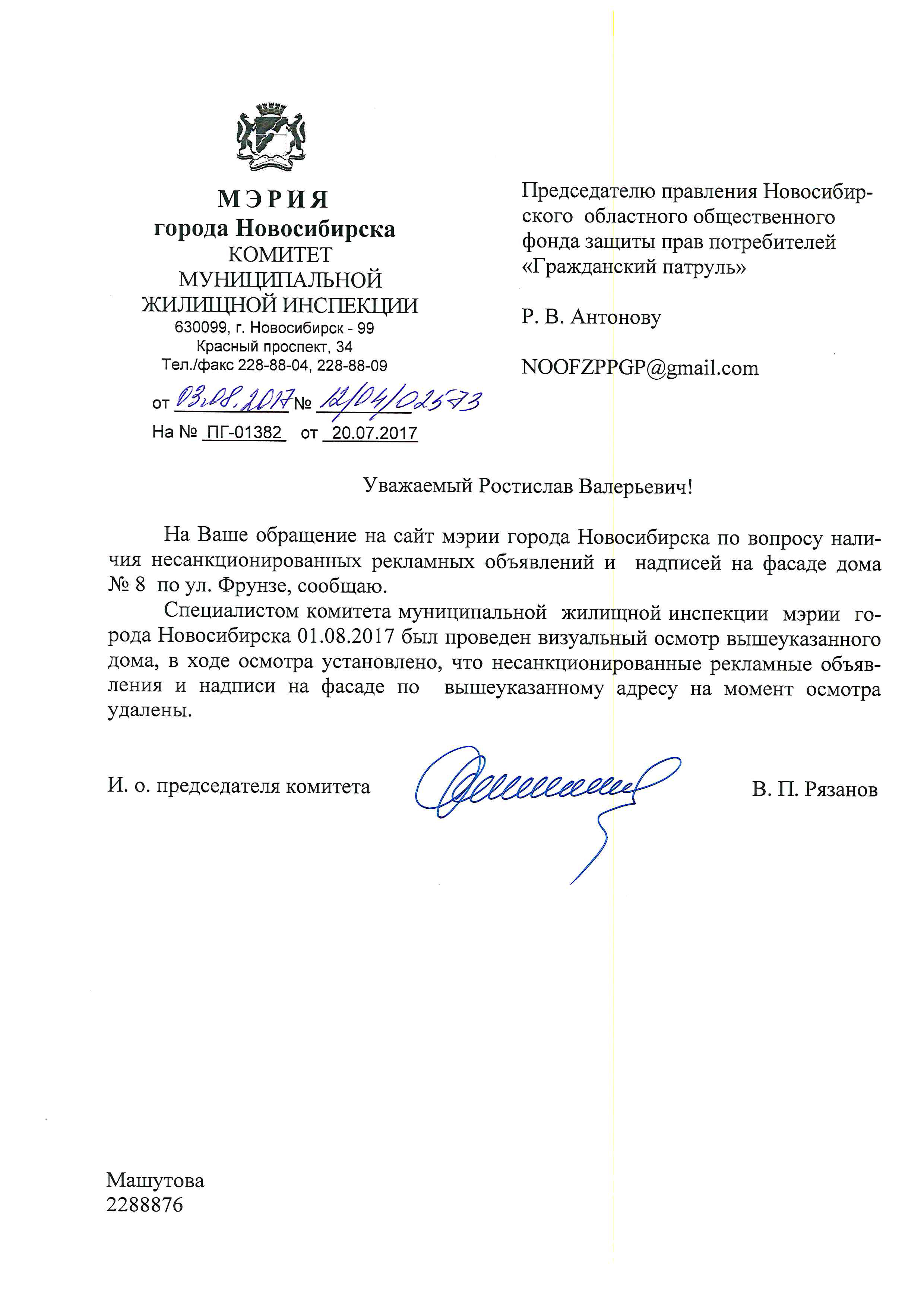 Номер жалобы:21148 Тип жалобы:Иные проблемы ЖКХ Название объекта:Управляющая Компания Регион:Новосибирская область Город:Новосибирск Адрес:Красный пр., 54/9 Описание жалобы:Фрунзе 9 надписи на хозяйственном корпусе Статус: