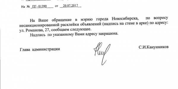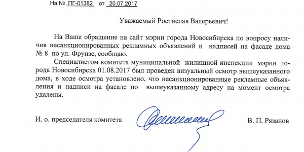 Номер жалобы:21150 Тип жалобы:Иные проблемы ЖКХ Название объекта:Управляющая Компания Регион:Новосибирская область Город:Новосибирск Адрес:Красный пр., 54/9 Описание жалобы:Фрунзе 9 надписи на фасаде дома Статус: