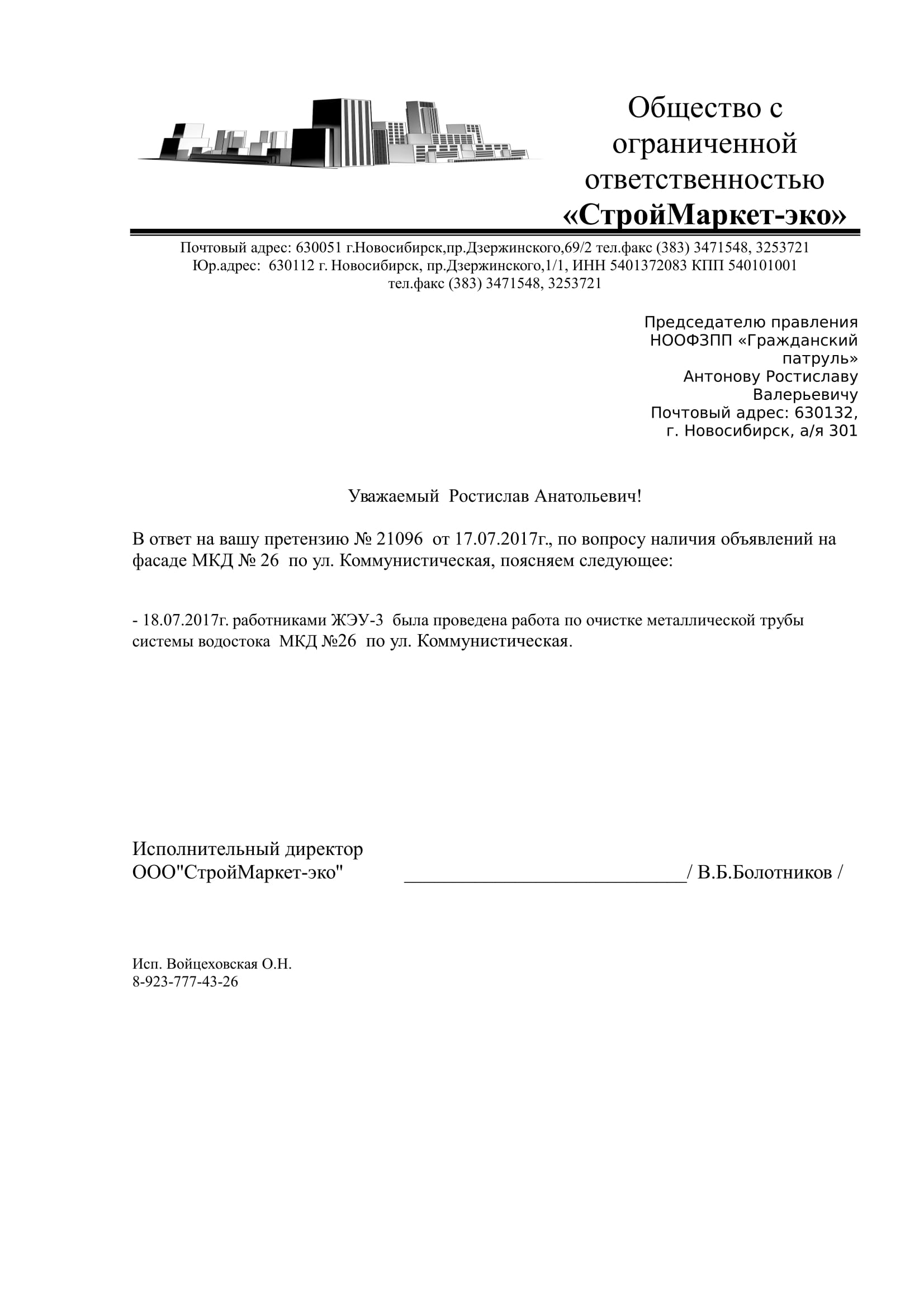 Номер жалобы:21099 Тип жалобы:Иные проблемы ЖКХ Название объекта:Управляющая Компания Регион:Новосибирская область Город:Новосибирск Адрес:Коммунистическая ул., 26 Описание жалобы:Надписи и объявления Статус: