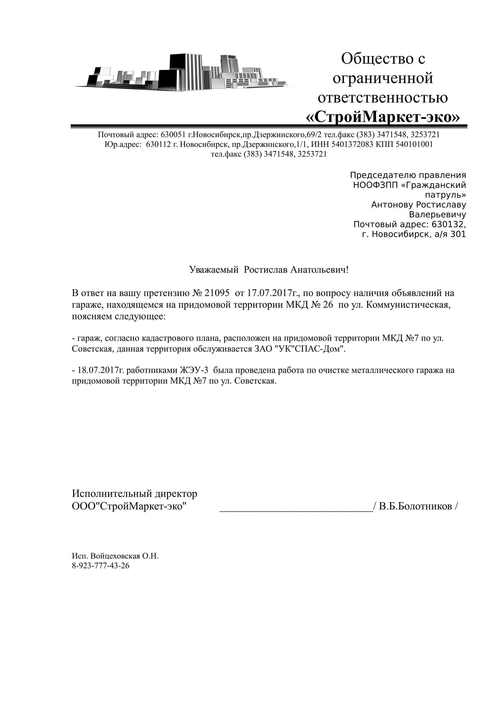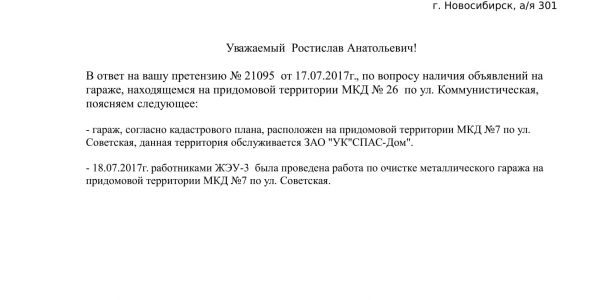 Номер жалобы:21097 Тип жалобы:Иные проблемы ЖКХ Название объекта:Управляющая Компания Регион:Новосибирская область Город:Новосибирск Адрес:Коммунистическая ул., 26 Описание жалобы:Объявления на гараже Статус: