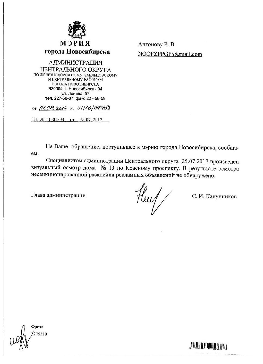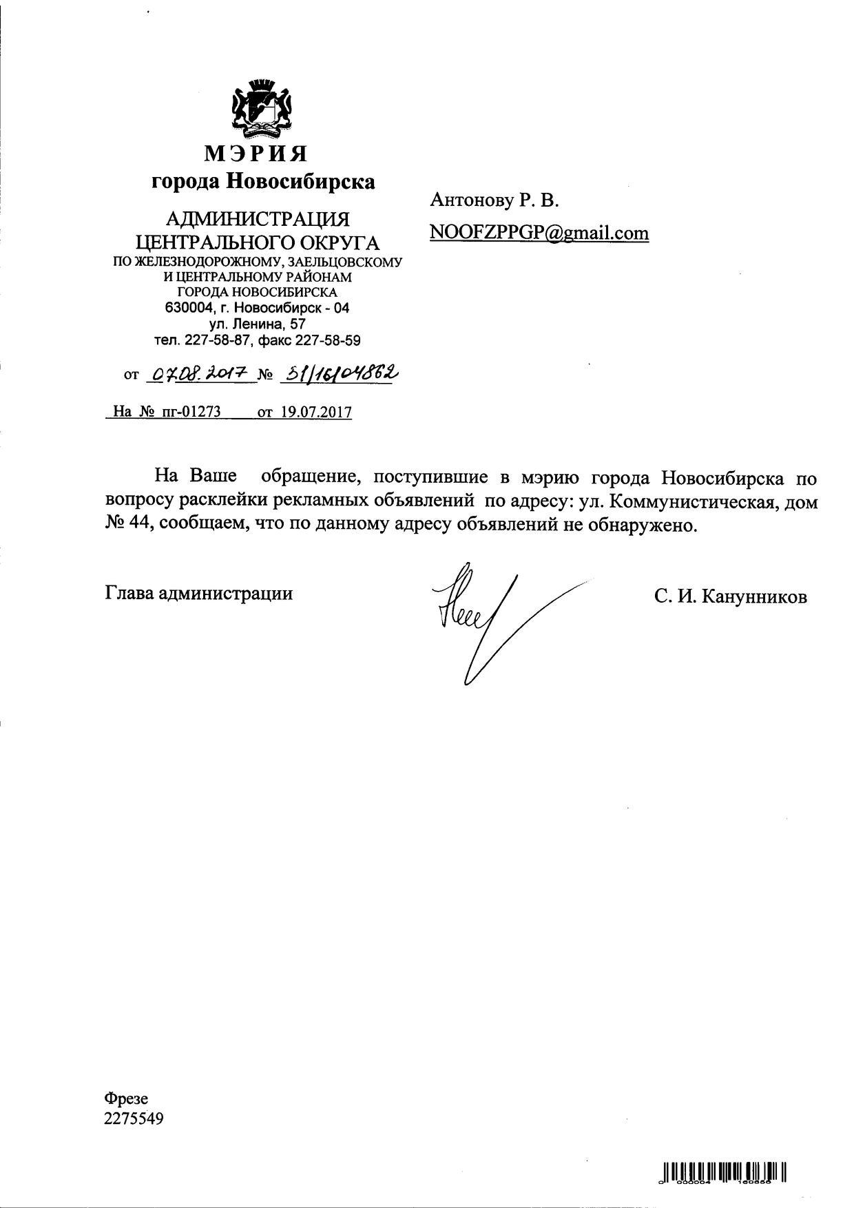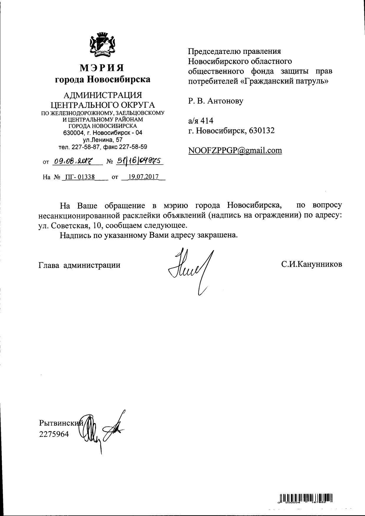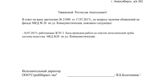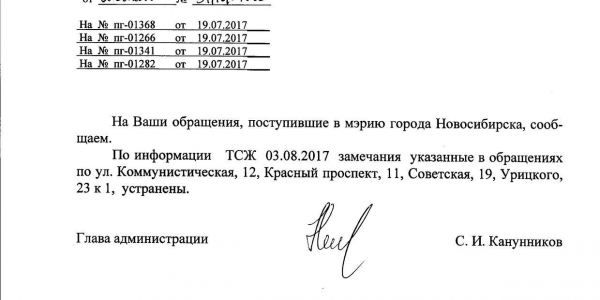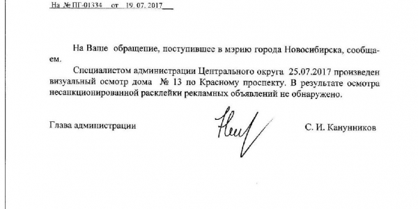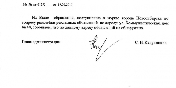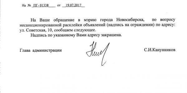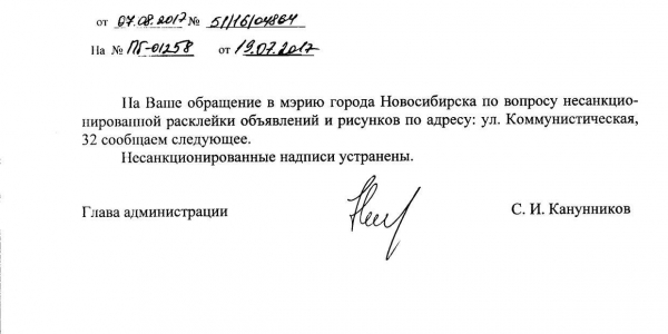 Номер жалобы:21118 Тип жалобы:Иные проблемы ЖКХ Название объекта:Управляющая Компания Регион:Новосибирская область Город:Новосибирск Адрес:Красный пр., 13 Описание жалобы:Надписи и объявления в неположенном месте Статус: