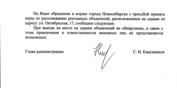 Номер жалобы:21078 Тип жалобы:Иные проблемы ЖКХ Название объекта:Управляющая Компания Регион:Новосибирская область Город:Новосибирск Адрес:Октябрьская ул., 17 Описание жалобы:Октябрьская 17 объявления на фасаде дома Статус:
