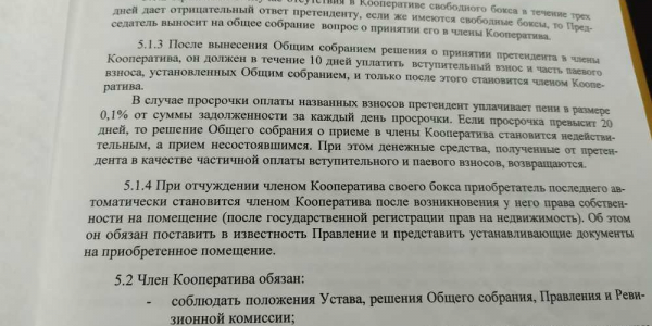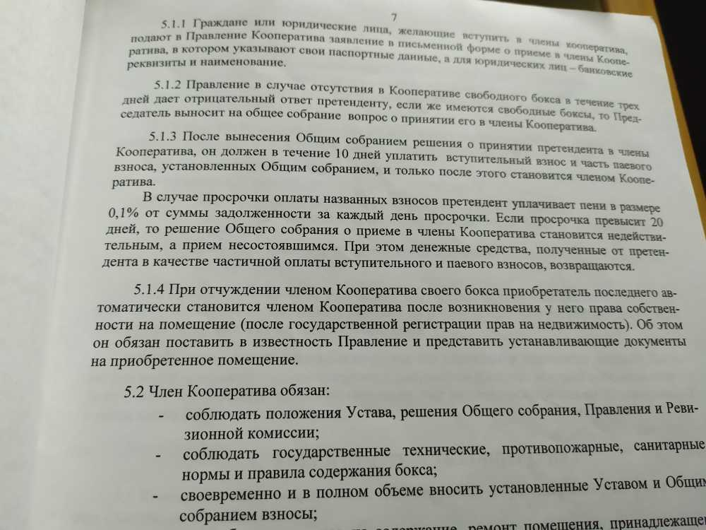 Номер жалобы:66658 Тип жалобы:Прочее Название объекта: Регион:Челябинская область Город:Златоуст Адрес:Златоуст, улица Шишкина, 13 Описание жалобы:Председатель потребительского кооператива "Урожай 2" ( ПК"Урожай 2") Осадчий Сергей Васильевич незаконно принуждает собственников, купивших боксы у предыдущих владельцев в ПК "Урожай 2", оплачивать вступительные взносы в размере 1000 рублей. Так же принуждает писать заявление о вступлении в данный кооператив, что так же является незаконным действием. У данного кооператива есть устав, который находится у председателя Осадчего С. В.,в котором указано, согласно п. 5.1.4. что : "В случае отчуждения членом кооператива своего бокса ,приобретатель последнего автоматически становится членом данного кооператива после возникновения у него права собственности на помещение(после гос. регистрации прав на недвижимость)".Вопреки данному пункту, угрожая отключить собственникам электроэнергию в боксе и сменить замки в рядах,не выдавая при этом ключи,тем самым сделав невозможным пользоваться по назначению своим боксом(хранение овощей), он вымогает деньги с собственников.На вопрос "куда будет потрачен этот незаконный доход?" никаких ответов не дает. Считаем,что таким образом председатель кооператива Осадчий С. В. незаконно обогащается за счет собственников, вновь купивших боксы в данном ПК. Отчеты на что были потрачены членские и вступительные взносы не показывает. Просим направить жалобу в прокуратуру и налоговую инспекцию г. Златоуста с просьбой провести проверку на выявление нарушений закона председателем кооператива Осадчим С. В. в отношении собственников ПК "Урожай 2", находящегося по адресу г. Златоуст, ул. Шишкина, 13. Статус: