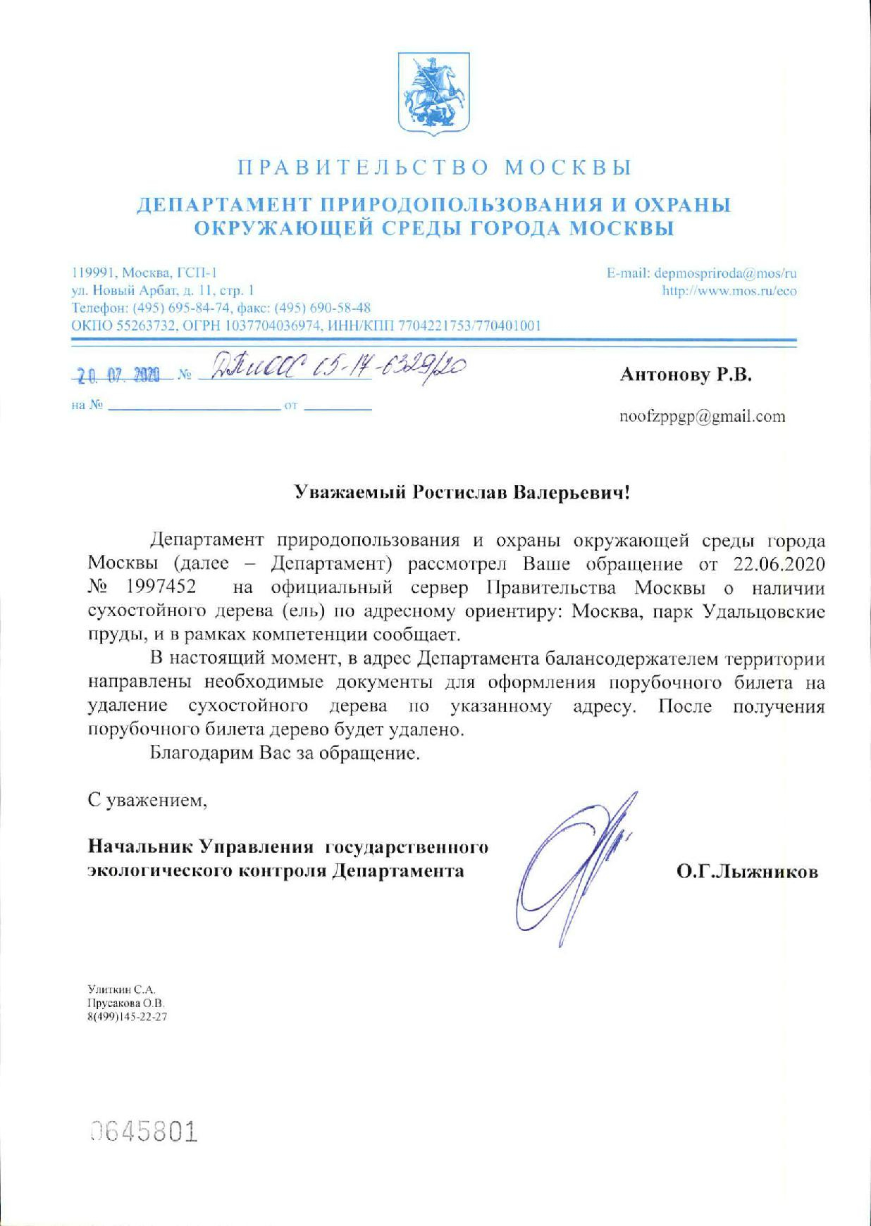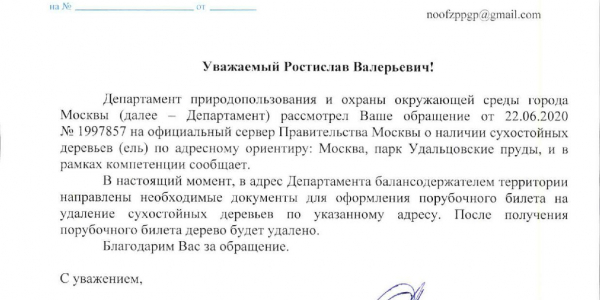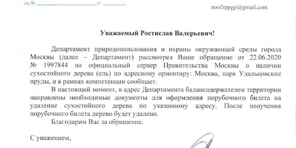 Номер жалобы:66699 Тип жалобы:Прочее Название объекта: Регион:Москва Город:Москва Адрес:парк Удальцовские пруды Описание жалобы:Между пешеходной дорожкой и мостом над оврагом погибла ель. Требуется заменить погибшее дерево. Местоположение очень близко к тому, что указано на скрине. Статус:
