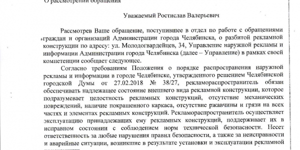 Номер жалобы:66614 Тип жалобы:Прочее Название объекта: Регион:Челябинская область Город:Челябинск Адрес:улица Молодогвардейцев, 34 Описание жалобы:Разбита рекламная конструкция Статус: