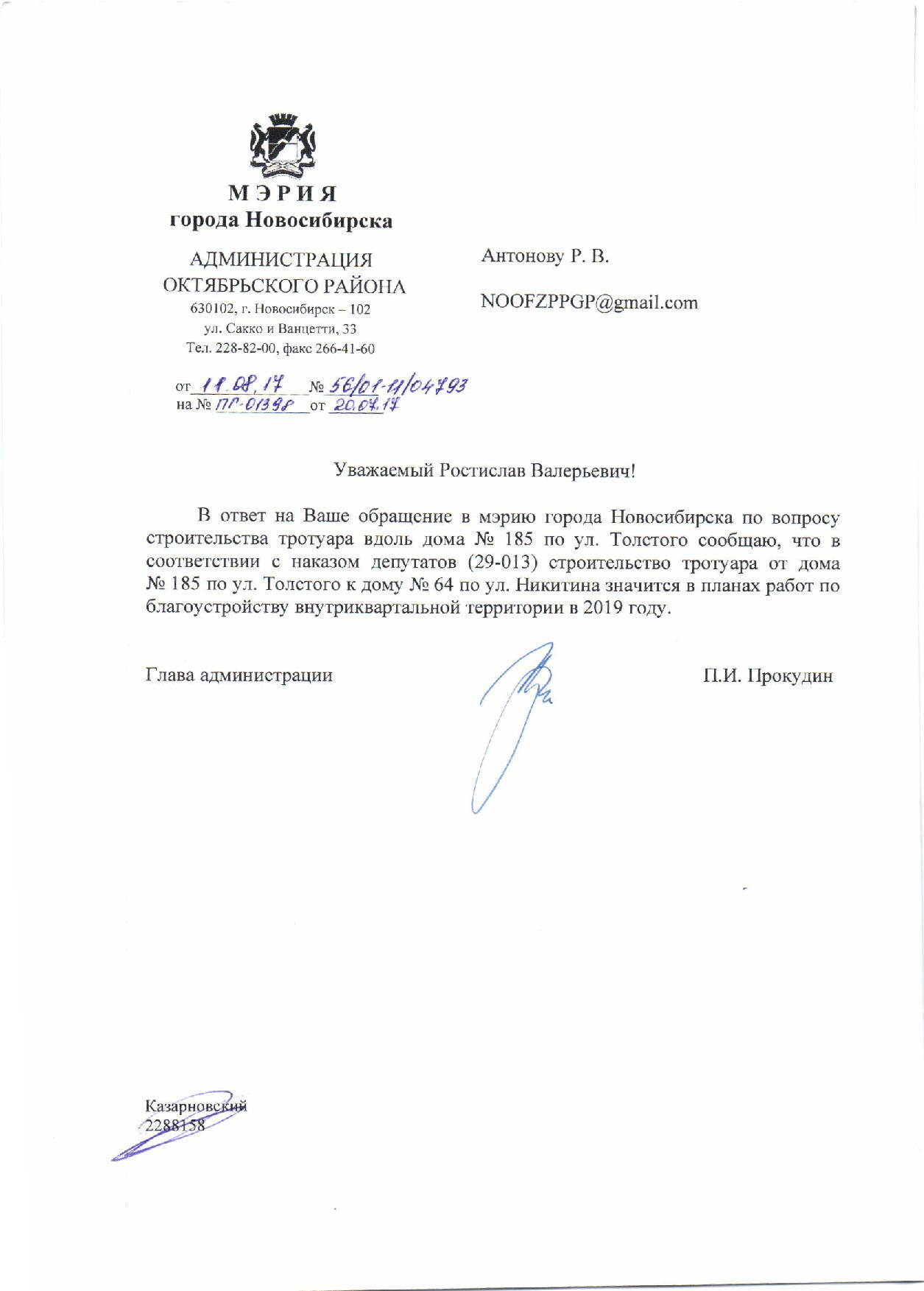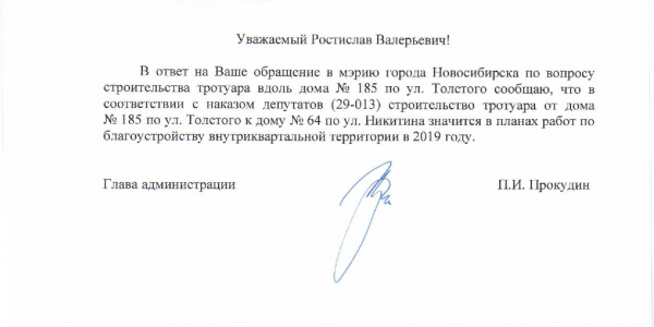Номер жалобы:21065 Тип жалобы:Иные проблемы ЖКХ Название объекта:гражданин Регион:Новосибирская область Город:Новосибирск Адрес:ул. Льва Толстого, 185 Описание жалобы:отсутствие тротуарных дорожек Статус: