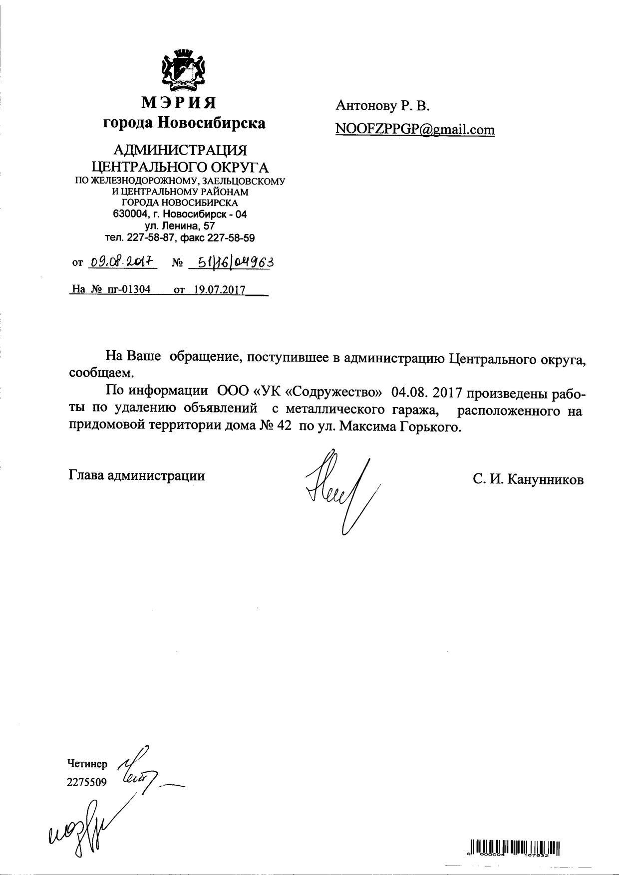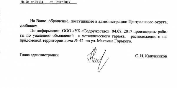 Номер жалобы:21066 Тип жалобы:Иные проблемы ЖКХ Название объекта:Управляющая Компания Регион:Новосибирская область Город:Новосибирск Адрес:ул. Максима Горького, 42 Описание жалобы:Объявления на гараже Статус: