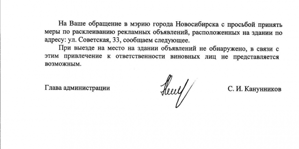Номер жалобы:21054 Тип жалобы:Иные проблемы ЖКХ Название объекта:Управляющая Компания Регион:Новосибирская область Город:Новосибирск Адрес:ул. Советская, 31 Описание жалобы:Надписи на фасаде Статус: