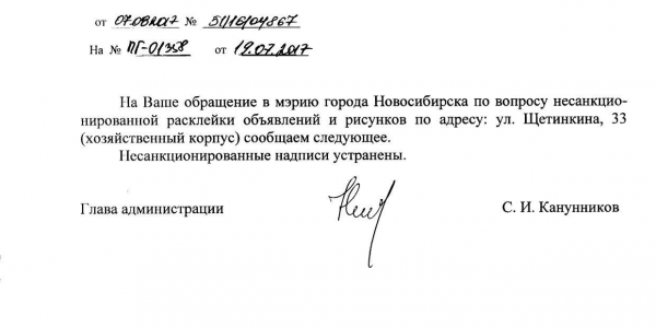 Номер жалобы:21053 Тип жалобы:Иные проблемы ЖКХ Название объекта:Управляющая Компания Регион:Новосибирская область Город:Новосибирск Адрес:ул. Щетинкина, 33 Описание жалобы:Надписи на хозяйственном корпусе Статус: