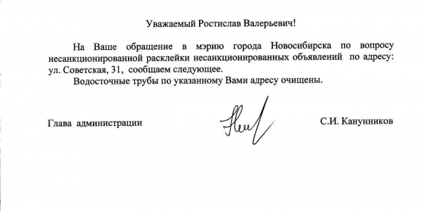 Номер жалобы:21058 Тип жалобы:Иные проблемы ЖКХ Название объекта:Управляющая Компания Регион:Новосибирская область Город:Новосибирск Адрес:ул. Советская, 31 Описание жалобы:Объявление на трубах Статус:
