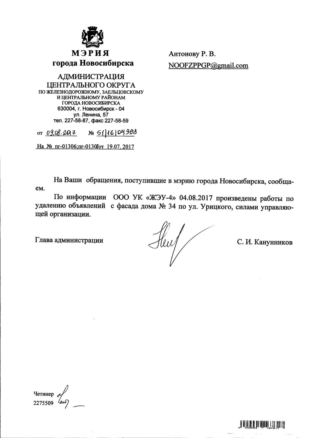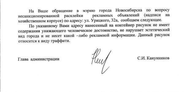 Номер жалобы:21027 Тип жалобы:Иные проблемы ЖКХ Название объекта:Управляющая Компания Регион:Новосибирская область Город:Новосибирск Адрес:ул. Урицкого, 32А Описание жалобы:Объявления и надписи на хозяйственном корпусе Статус: