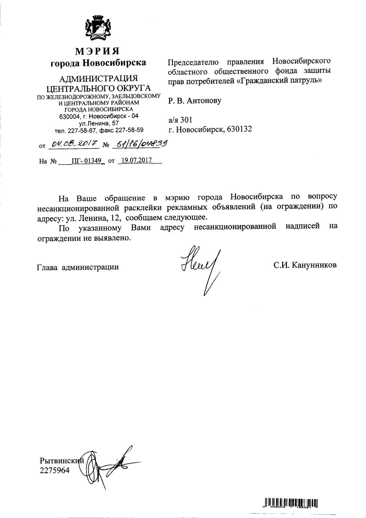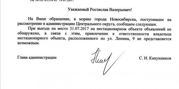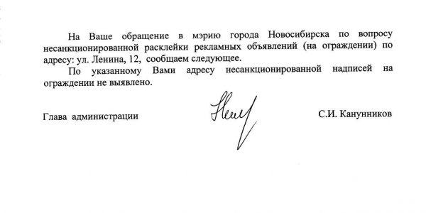 Номер жалобы:21042 Тип жалобы:Иные проблемы ЖКХ Название объекта:Администрация Регион:Новосибирская область Город:Новосибирск Адрес:ул. Ленина, 9 Описание жалобы:Объявление на киоске Статус: