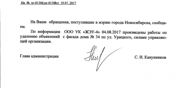 Номер жалобы:21008 Тип жалобы:Иные проблемы ЖКХ Название объекта:Управляющая Компания Регион:Новосибирская область Город:Новосибирск Адрес:ул. Урицкого, 35 Описание жалобы:Объявления на фасаде Статус: