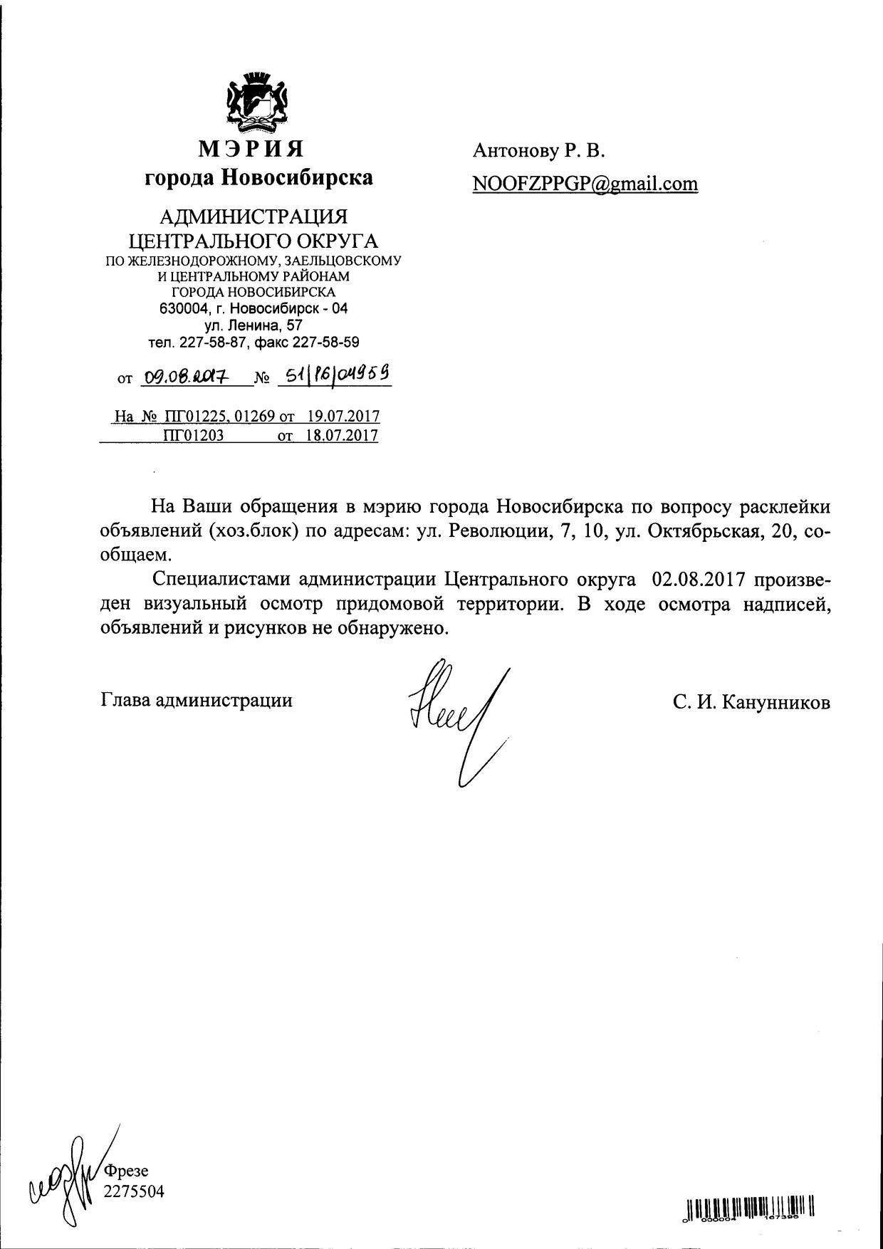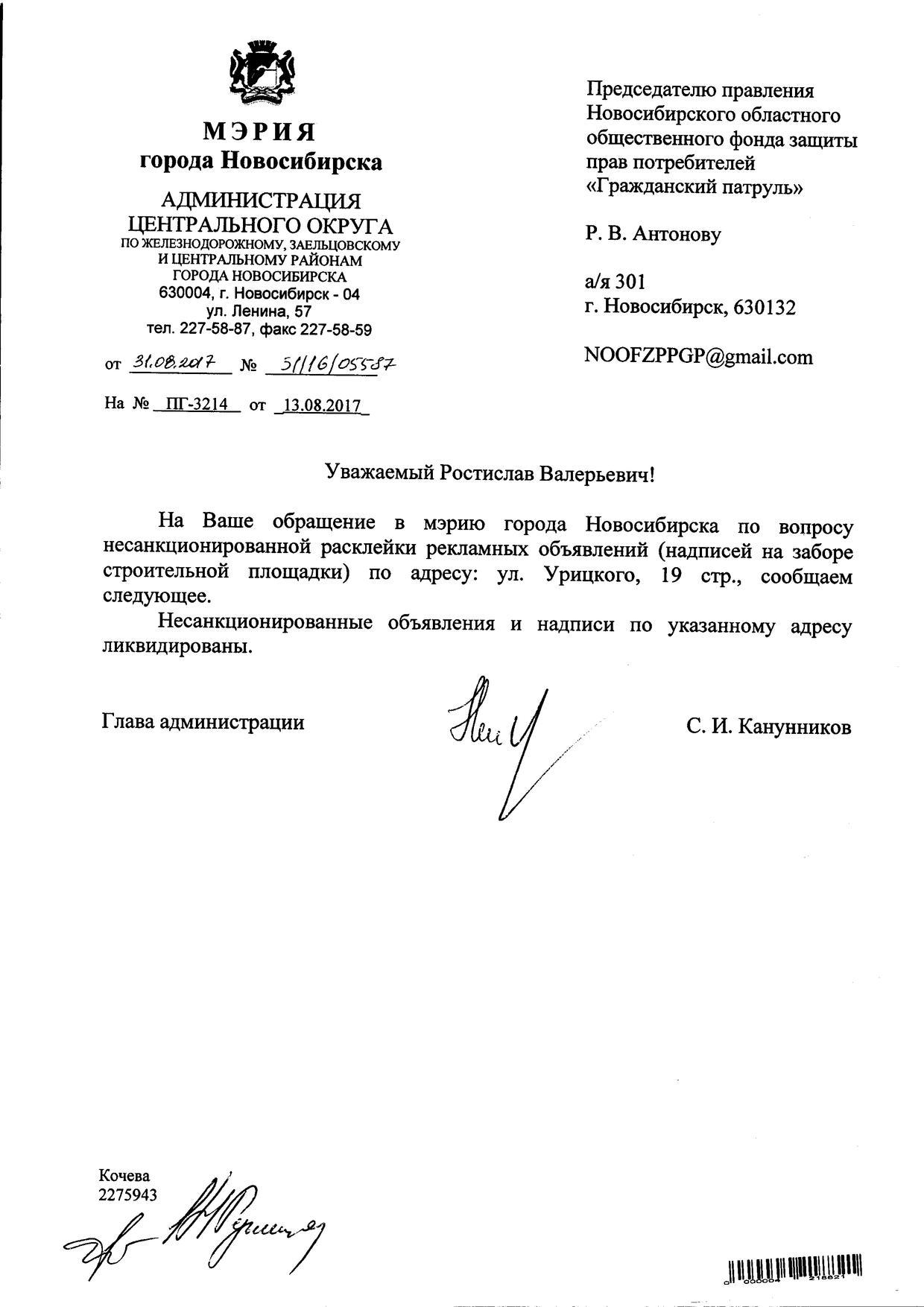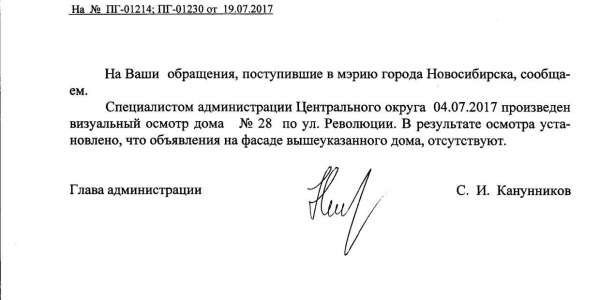 Номер жалобы:20969 Тип жалобы:Иные проблемы ЖКХ Название объекта:Управляющая Компания Регион:Новосибирская область Город:Новосибирск Адрес:ул. Революции, 10 Описание жалобы:Объявления на хозяйственном корпусе Статус: