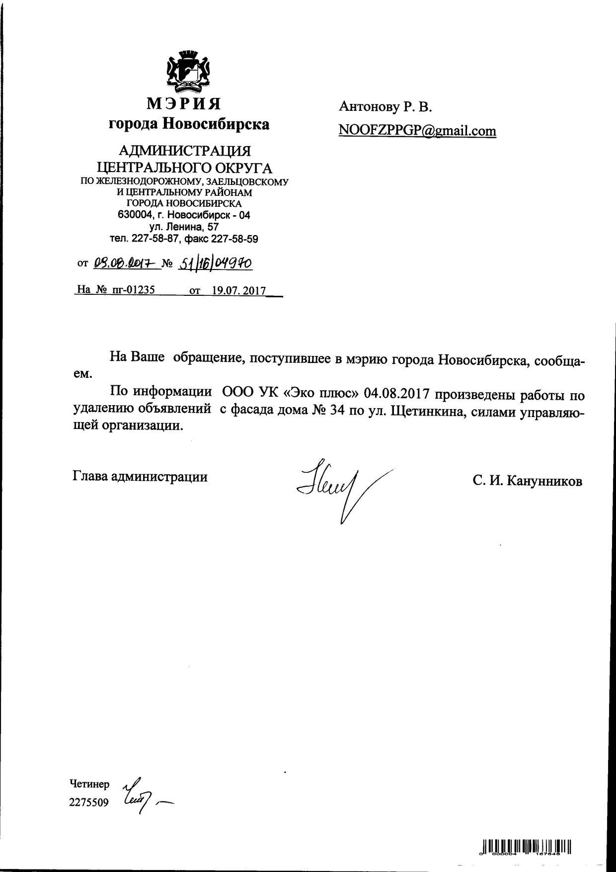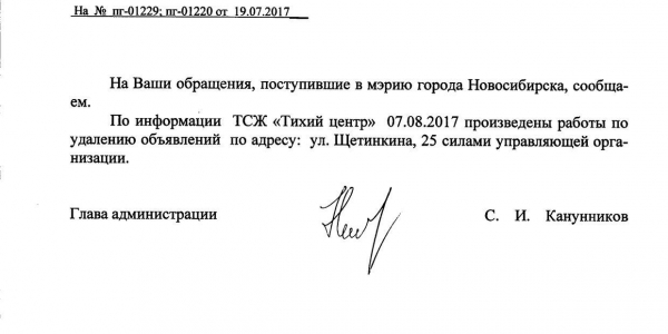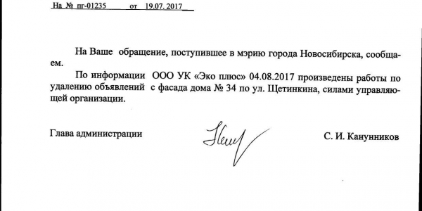 Номер жалобы:20980 Тип жалобы:Иные проблемы ЖКХ Название объекта:Управляющая Компания Регион:Новосибирская область Город:Новосибирск Адрес:ул. Щетинкина, 25 Описание жалобы:Объявления в неположенном месте Статус: