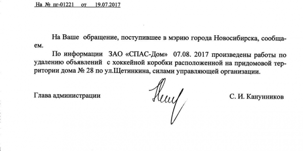 Номер жалобы:20979 Тип жалобы:Иные проблемы ЖКХ Название объекта:Управляющая Компания Регион:Новосибирская область Город:Новосибирск Адрес:ул. Щетинкина, 25 Описание жалобы:Надписи на хоккейной коробке Статус: