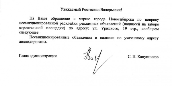 Номер жалобы:20982 Тип жалобы:Иные проблемы ЖКХ Название объекта:Управляющая Компания Регион:Новосибирская область Город:Новосибирск Адрес:ул. Урицкого, 21 Описание жалобы:Объявления в неположенном месте (забор стройплощадки рядом с указанным адресом) Статус: