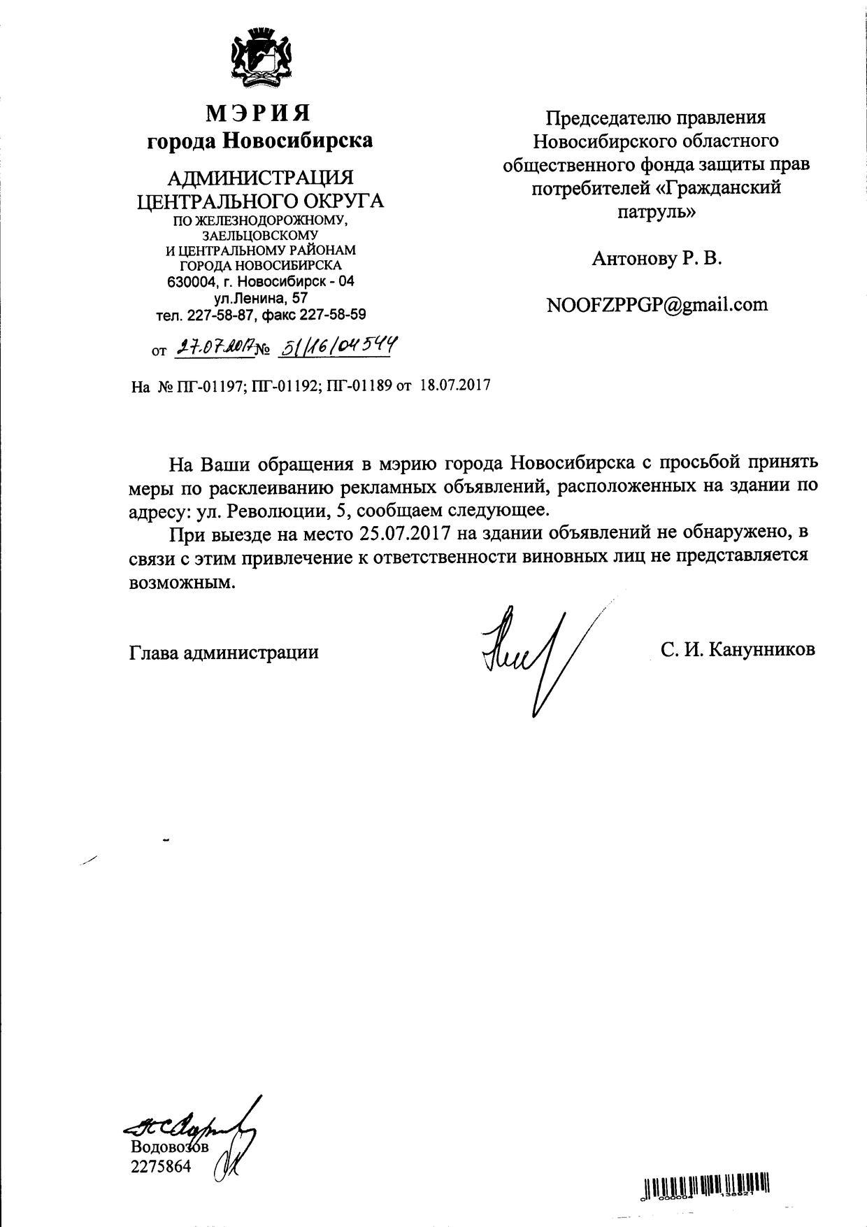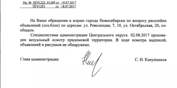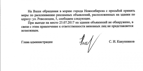 Номер жалобы:20933 Тип жалобы:Иные проблемы ЖКХ Название объекта:Управляющая Компания Регион:Новосибирская область Город:Новосибирск Адрес:ул. Революции, 5 Описание жалобы:Объявления в неположенном месте Статус: