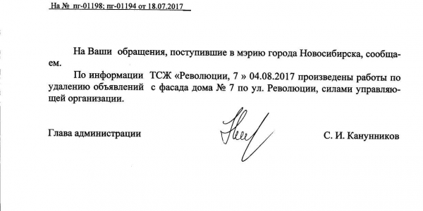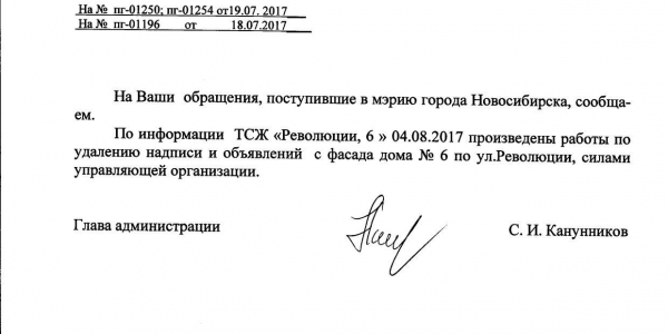 Номер жалобы:20928 Тип жалобы:Иные проблемы ЖКХ Название объекта:Управляющая Компания Регион:Новосибирская область Город:Новосибирск Адрес:ул. Революции, 7 Описание жалобы:Надписи на фасаде Статус: