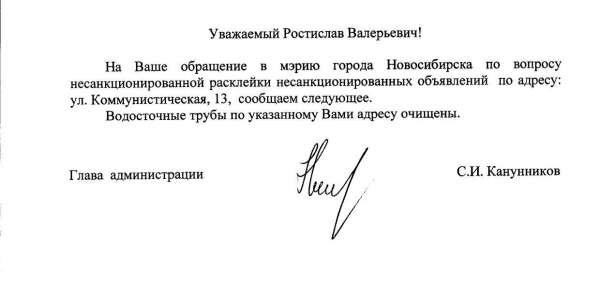 Номер жалобы:20939 Тип жалобы:Иные проблемы ЖКХ Название объекта:Управляющая Компания Регион:Новосибирская область Город:Новосибирск Адрес:Коммунистическая ул., 13 Описание жалобы:Объявления на фасаде дома Статус: