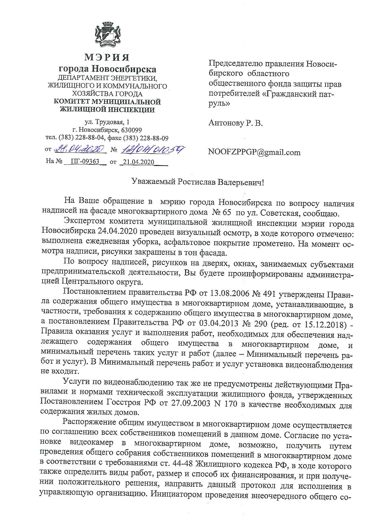 Номер жалобы:65504 Тип жалобы:Ненадлежащее содержание фасада строения, здания, сооружения Название объекта: Регион:Новосибирская область Город:Новосибирск Адрес:улица Фрунзе, 15А Описание жалобы:разрушение отделки здания, осыпается покраска, видна кирпичная кладка стен, отваливается отделка нижней части здания, выступов и балюстрады на крыше здания (перила). также присутствуют надписи на стенах. а также неудовлетворительное состояние парапетов газонов перед зданием - отваливается отделка, разрушается кирпичная кладка.
