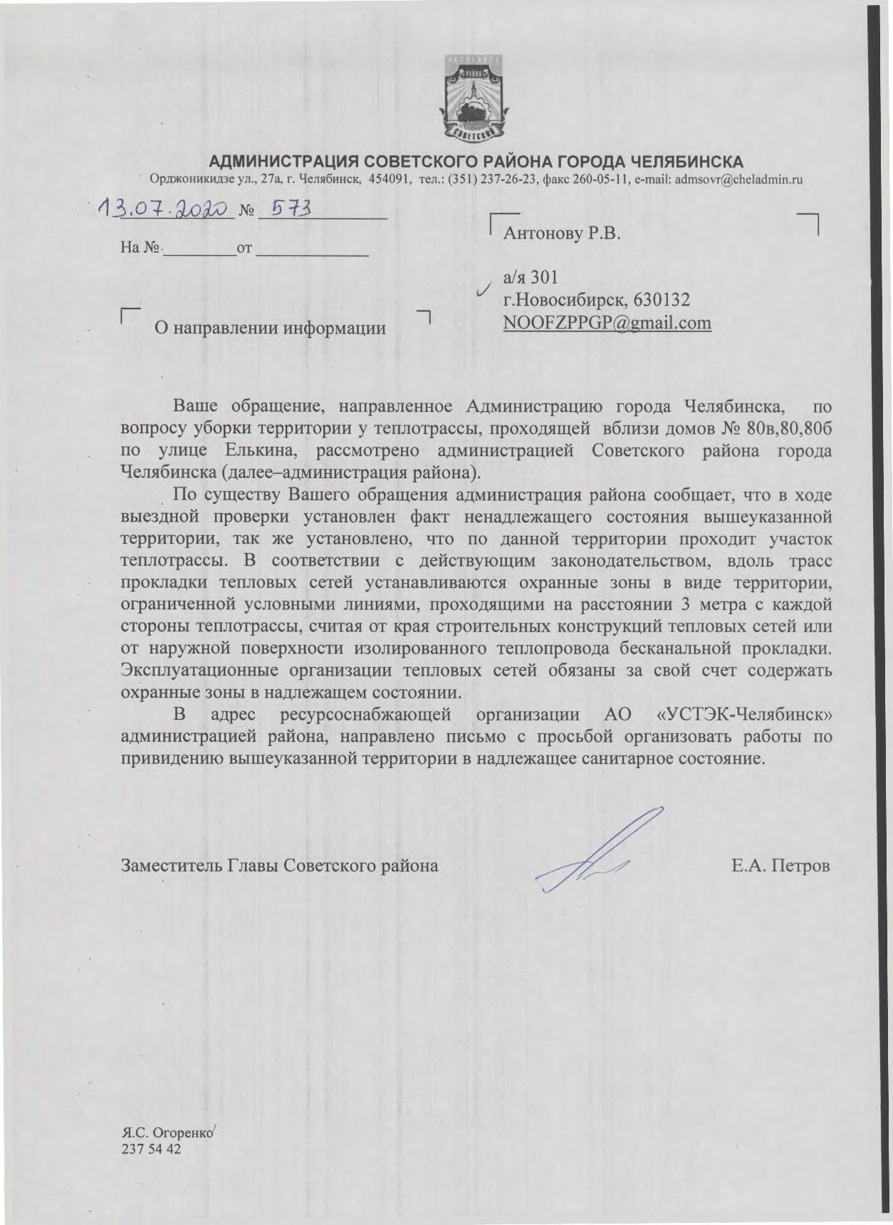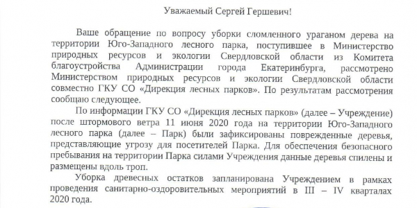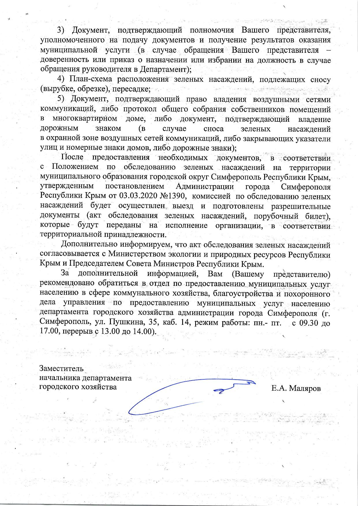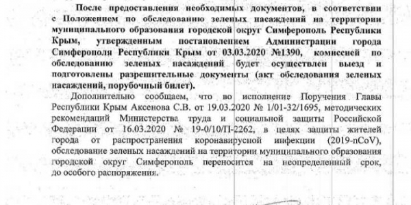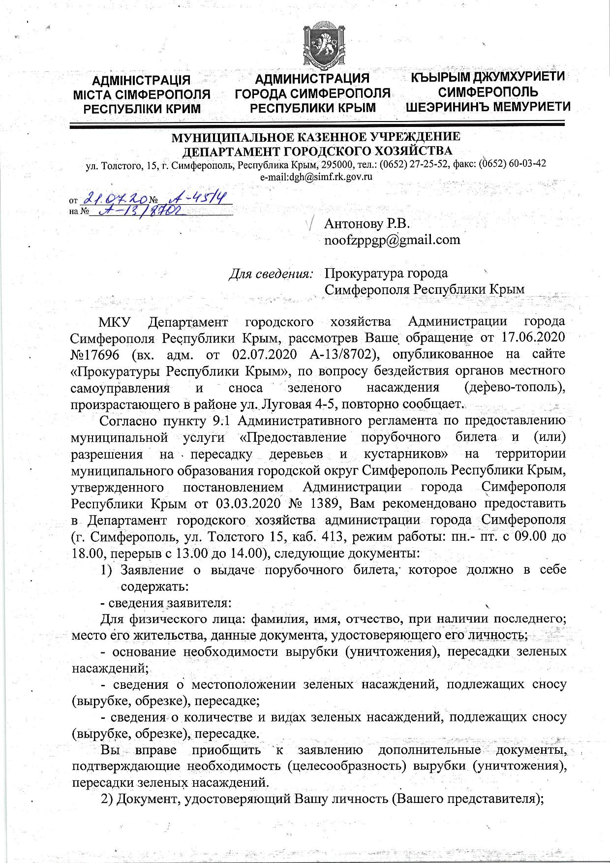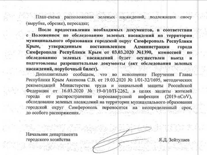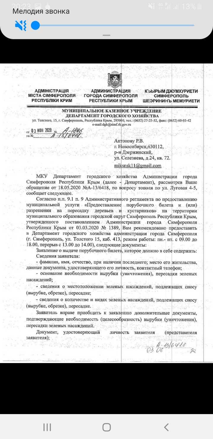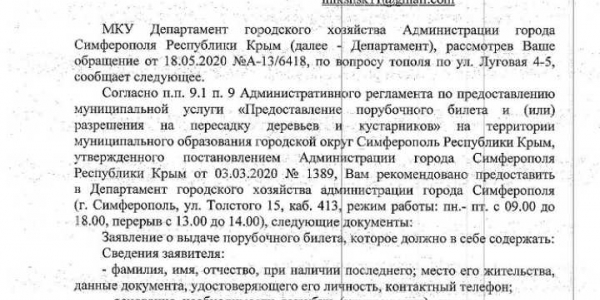 В ответ на обращение Антонова Р.В. Администрация Симферополя не предприняла никаких мер: не произведено обследование двадцати метрового тополя, не приняты меры административного контроля, не определен собственник дерева, не предпринято мер муниципального контроля - не выдано предписание на снос дерева собственнику земельного участка, не выдано задание МБУ Город на снос дерева.