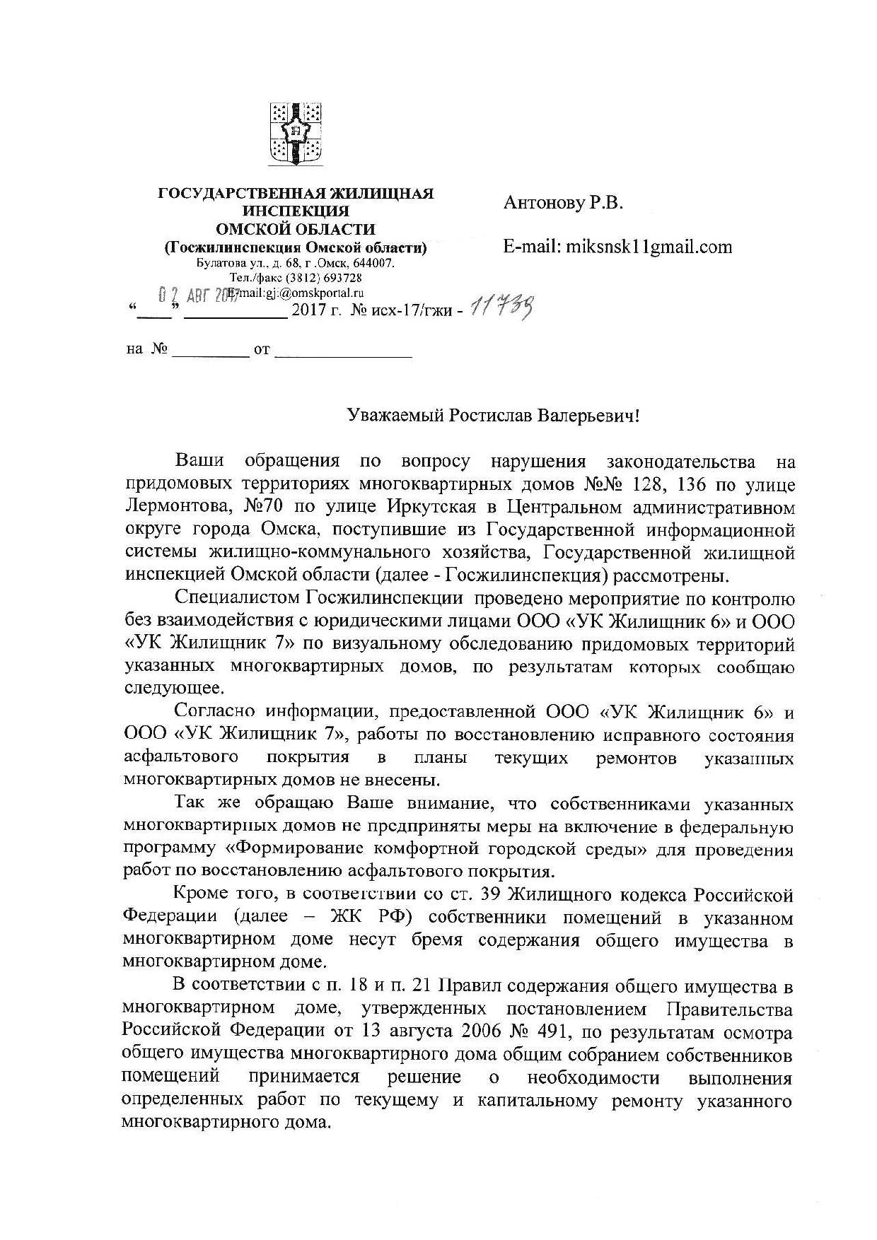 Номер жалобы:20624 Тип жалобы:Иные проблемы ЖКХ Название объекта:Управляющая Компания Регион:Новосибирская область Город:Новосибирск Адрес:ул. Ермака, 4 Описание жалобы:Надписи на хозяйственном корпусе Статус: