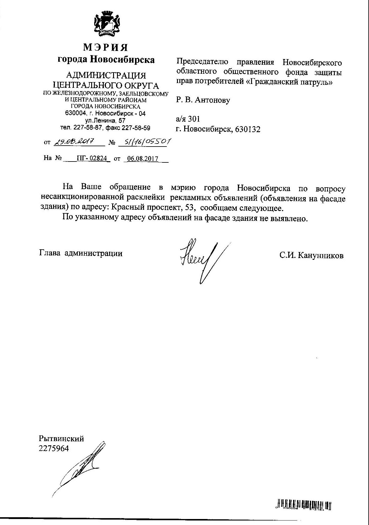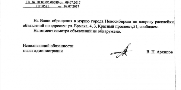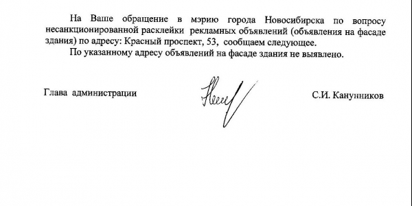 Номер жалобы:20625 Тип жалобы:Иные проблемы ЖКХ Название объекта:Управляющие Компании Регион:Новосибирская область Город:Новосибирск Адрес:Красный пр., 53 Описание жалобы:Красный проспект 53 объявления на фасаде Статус: