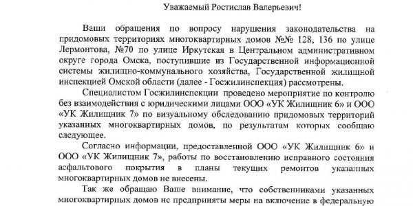 Номер жалобы:20635 Тип жалобы:Иные проблемы ЖКХ Название объекта:Мэрия Регион:Омская область Город:Омск Адрес:ул. Лермонтова, 128 Описание жалобы:Разрушения у другого подъезда этого же дома Статус: