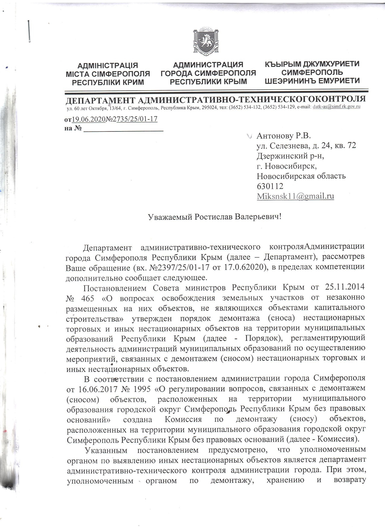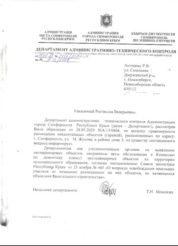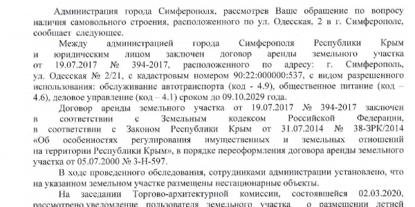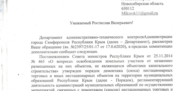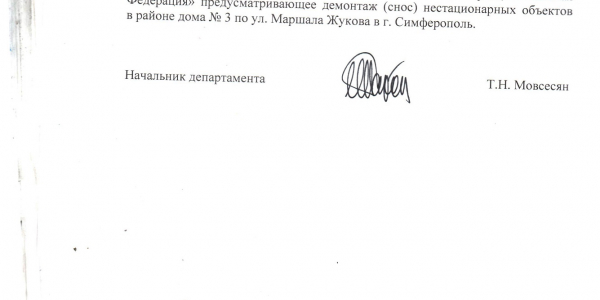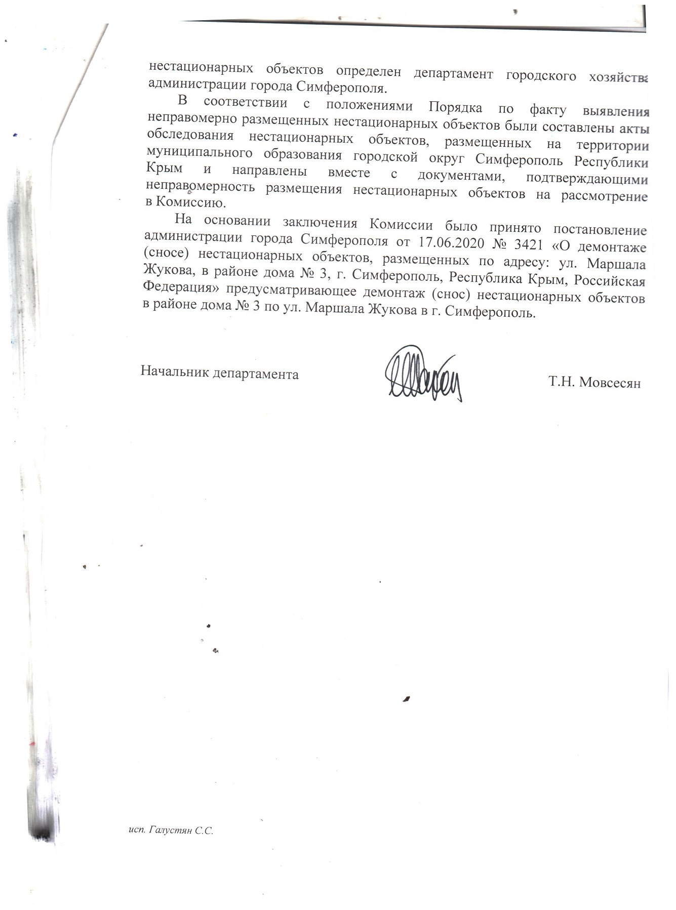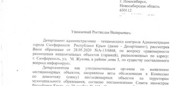 1. Направить ответным письмом копии актов обследования нестационарных объектов, расположенных по адресу г. Симферополь,ул. Маршала Жукова в районе дома номер 3.