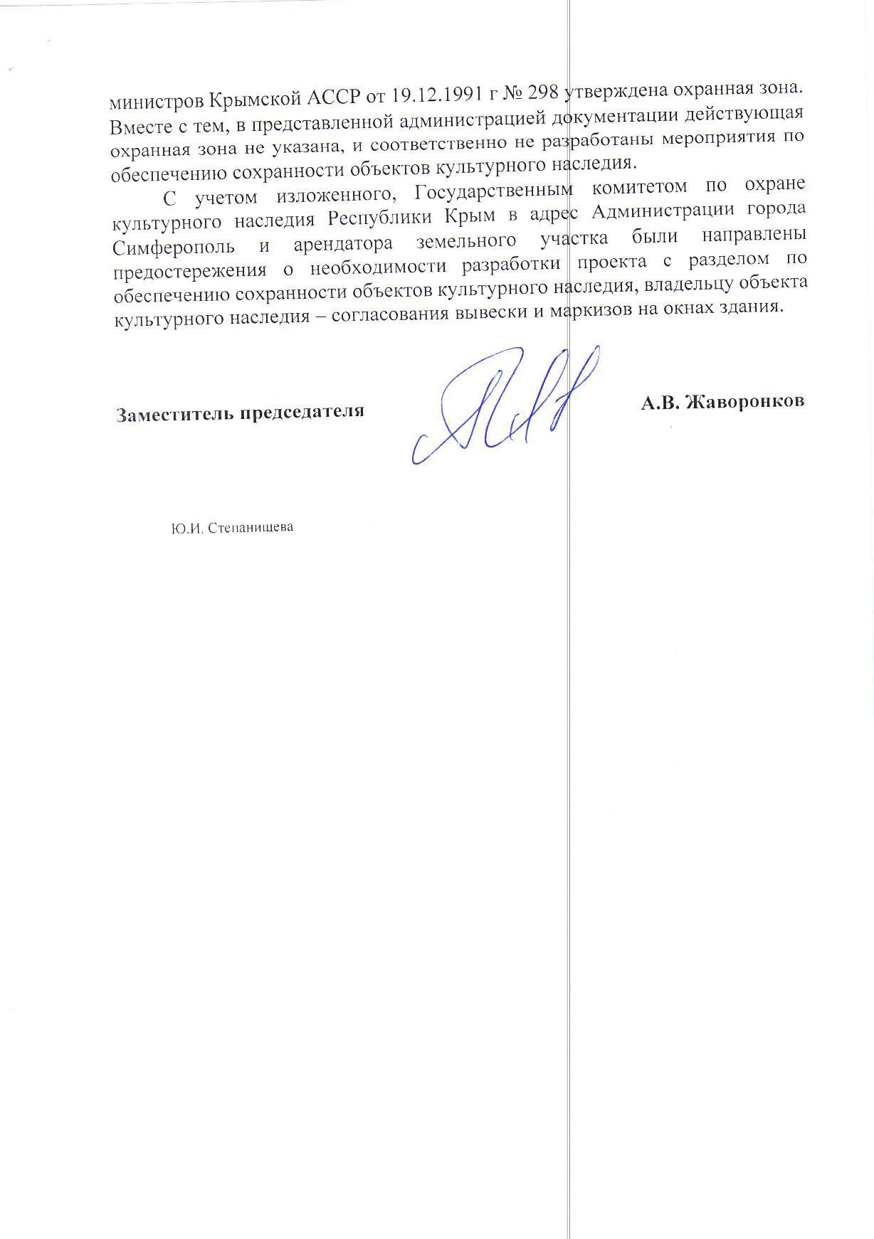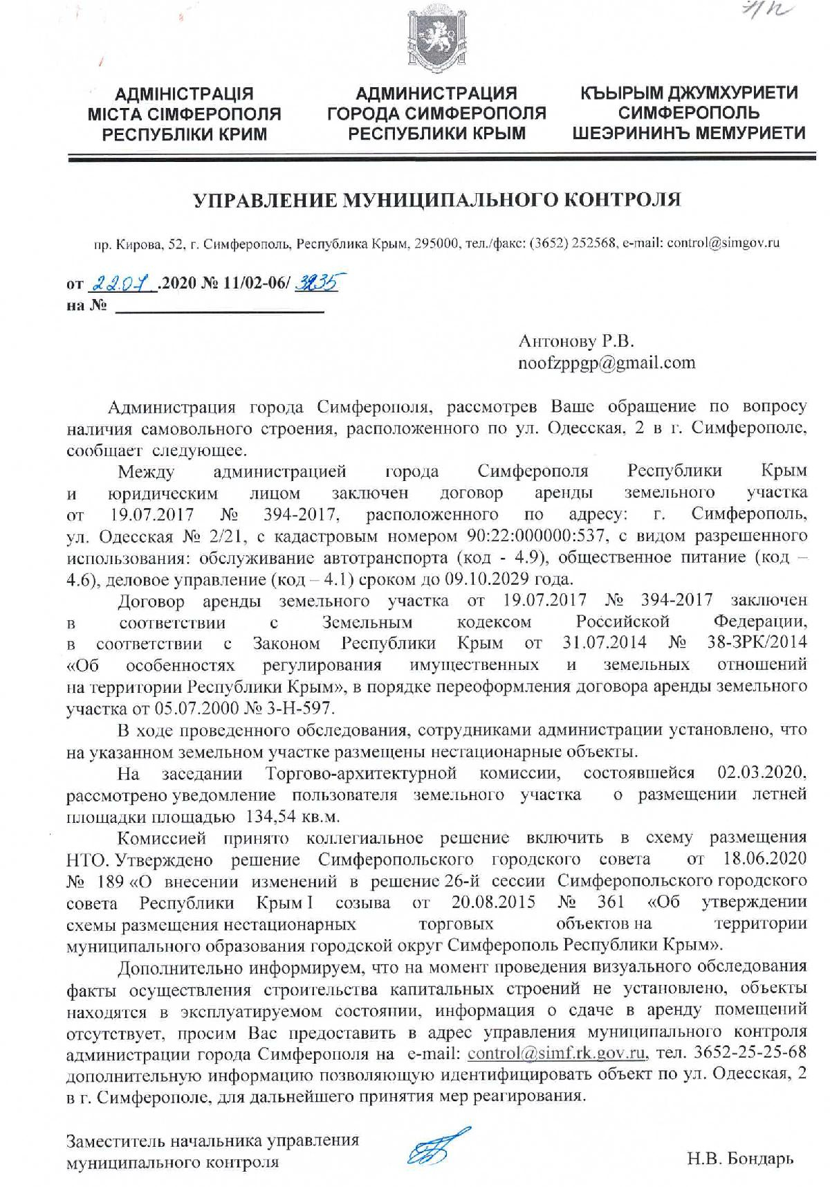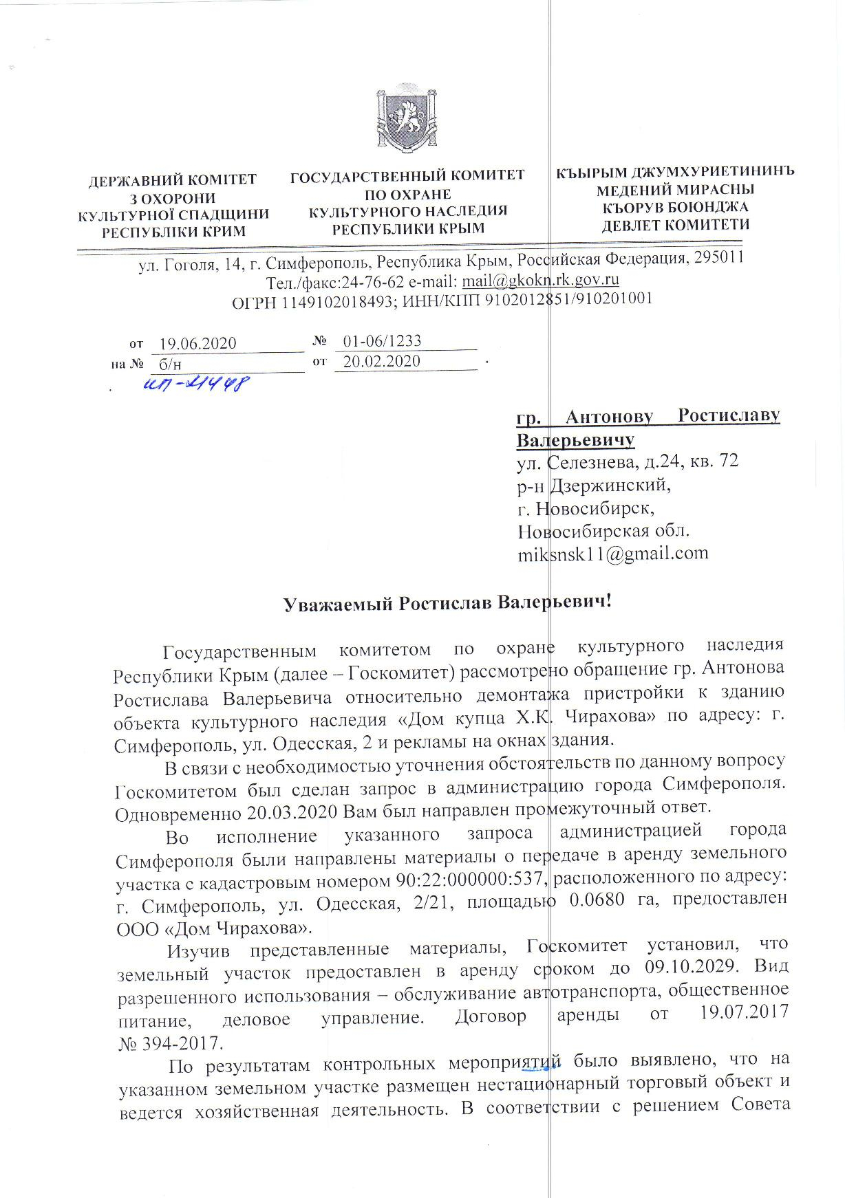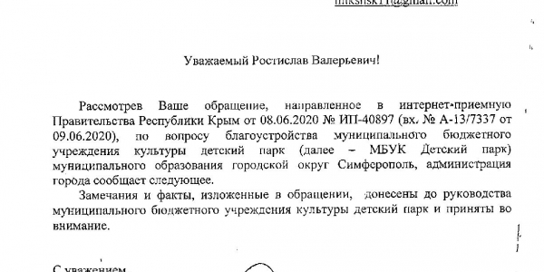 1. Направить ответным письмом копии актов обследования нестационарных объектов, расположенных по адресу г. Симферополь,ул. Маршала Жукова в районе дома номер 3.